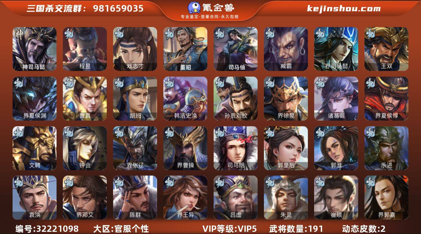 【4277】官阶:中军将军;VIP等级:VIP5;史诗武将数量:5;动态皮肤数量:2;武将总数:191;史诗宝珠数量:1;将魂数量:1065;神将:1;魏国史诗武将:2;蜀国史诗武将:1;吴国史诗武将:0;群史诗武将:1 神司马懿,戏志才,程昱,谋赵云,谋张角,SP关羽,SP蔡文姬,乐进,曹昂,诸葛诞,朱灵,文聘,SP姜维,钟会,曹冲,郭淮,满宠,界王异,界曹操,界司马懿,界夏侯惇,界张辽,界郭嘉,曹真,韩浩史涣,陈群,曹叡,钟繇,司马朗,郭皇后,孙资刘放,吕虔,界徐晃,杜畿,界邓艾,张恭,界曹植,袁涣,王双,崔琰,谋于禁,谋荀彧,胡班,司马伷,界夏侯渊,臧霸,唐咨,董昭,势陈到,夏侯霸,马良,关兴张苞,廖化,界马岱,关平,刘封,界关兴张苞,界刘备,界关羽,界马超,SP徐庶,吴懿,周仓,张松,刘谌,夏侯氏,严颜,界庞统,界孟获,吕凯,邓芝,界简雍,糜夫人,彭羕,界张嶷,诸葛果,甘夫人,凌操,大乔小乔,诸葛瑾,孙鲁育,程普,韩当,潘璋马忠,虞翻,朱然,界甘宁,界黄盖,界周瑜,界大乔,界陆逊,孙鲁班,朱桓,顾雍,界孙权,周鲂,界张昭张纮,卫温诸葛直,陈武董袭,蒋钦,吕范,界孙鲁班,伏完,刘协,界袁术,张宝,李儒,华雄,袁术,界华佗,界吕布,公孙瓒,蔡夫人,蹋顿,SP黄月英,刘虞,界貂蝉,卢植,界庞德,樊稠,刘繇,界刘表,星张郃,界公孙瓒,谋卢植,谋贾诩,李傕郭汜,势田丰,神司马懿-鉴往知来(动态),神张辽-散敌擒孙,曹丕-龙年中秋(动态)