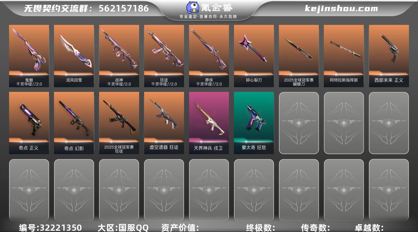 S193916【2025全球冠军赛套装/千灵华绽//2.0套装】无畏契约/97等级/青铜段位/26英雄/38皮肤/资产22860/已使用R点630/剩余R点0/ 2025全球冠军赛-狂徒,2025全球冠军赛-蝴蝶刀,千灵华绽//2.0-狂徒,千灵华绽//2.0-战神,千灵华绽//2.0-莽侠,千灵华绽//2.0-鬼魅,流风回雪,虚空遗器-狂徒,奇点-幻影,天界神兵-戍卫,碎心裂刃,阿特拉斯指挥部-甩棍,西部未来-正义,奇点-正义