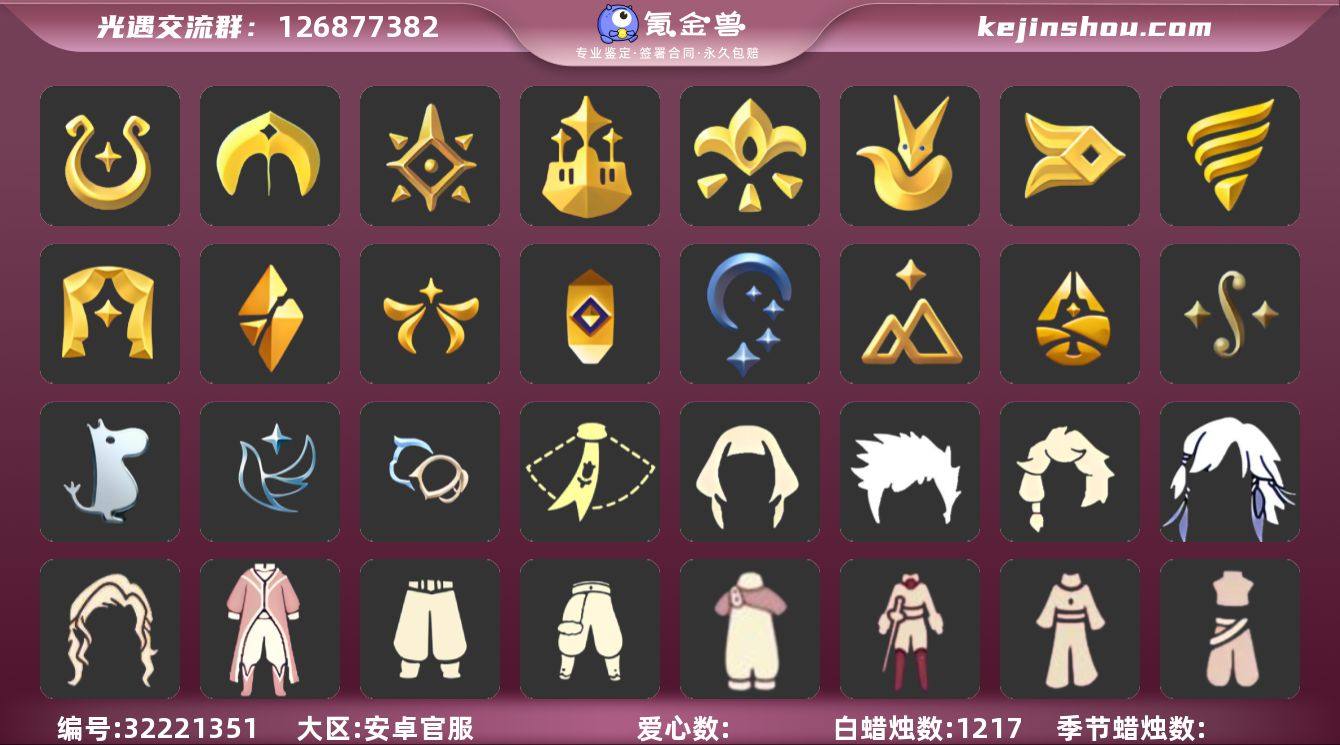[17179992]安卓官服 手机账号 8珍稀物品 20毕业季 6毕业图 1217蜡烛 【珍稀物品】魔法季耳坠(双边耳坠)(魔法耳坠),白枭(帝企鹅发),阿努比斯(狗头),玫瑰花,透明蝶翼斗,彩虹围巾(五塑彩带斗),咖喱(阿拉丁帽),鳐鲲斗篷 【季节已毕业】青鸟季,迁徙季,双星季,魔法季,圣岛季,预言季,梦想季,集结季,小王子季(王子季),风行季,潜海季,表演季,破晓季,欧若拉季(欧若拉),追忆季,夜行季,拾光季,归巢季,二重奏季,姆明季 【完成地图】晨岛,云野,雨林,霞谷,墓土(暮土),禁阁 【礼包】青衫落拓礼包,周年影院套餐礼包,兔子鞋(兔子拖鞋),暗彩装扮(彩虹武士裤),奔跑发型(奔离远行发),彩虹帽(多彩绒帽),南瓜(冥龙南瓜),巫师(巫师帽),绊爱(绊爱斗篷)(绊爱礼包),雪花(雪花发夹),贝壳(贝壳发饰),兔子(玉兔头饰)(玉兔发饰)(兔子发饰),四叶草(四叶草头饰),星月头饰(星月头冠),彩虹耳机,创始人(创始人斗篷),围巾(小王子斗篷)(小王子围巾),星球斗(星球夹克),福娃(福娃礼包)(春之日礼包)(铜钱斗),蝙蝠套(蝙蝠斗篷)(南瓜头),猫套(皮皮猫斗)(皮皮猫礼包),吉他(音韵吉他)(白吉他),人声乐器(欧若拉之声),灯笼(中秋灯笼),飞鸟纸伞,秋千(情人秋千),小狐狸(狐狸背包),猫背饰(猫咪背饰),雪花球(雪花水晶球),小狗周年发饰(小狗周年头饰) 【裤子】青鸟尊贵蓬头裤子(蓝色燕尾服),妮妮裙子(妮妮长裙),王子服(小王子套装),蓝绿裤(高领舞服),武士裤,背带裤,搓澡巾,击剑裤 【面具】黄眉企鹅面具,夜行毕业面具(棕熊面具),呼吸面具(潜水面具),贴花面具(丛林黑面具),阿努比斯,凤凰面具 【面饰】黑框眼镜(粗框眼镜),青鸟毕业面饰(青鸟面饰),红耳机 【项链】围巾(肩带) 【发型】小王子发型,单侧绑发(单边小辫),留辫蘑菇头,虚荣,归巢毕业发型(五塑彩羽发),若笠(箬笠) 【头饰】平顶帽,蓝色音乐会(蓝色音乐符),行军锅头盔(六边锅帽子)(双耳锅帽子),牛仔帽(西部帽),羽毛...