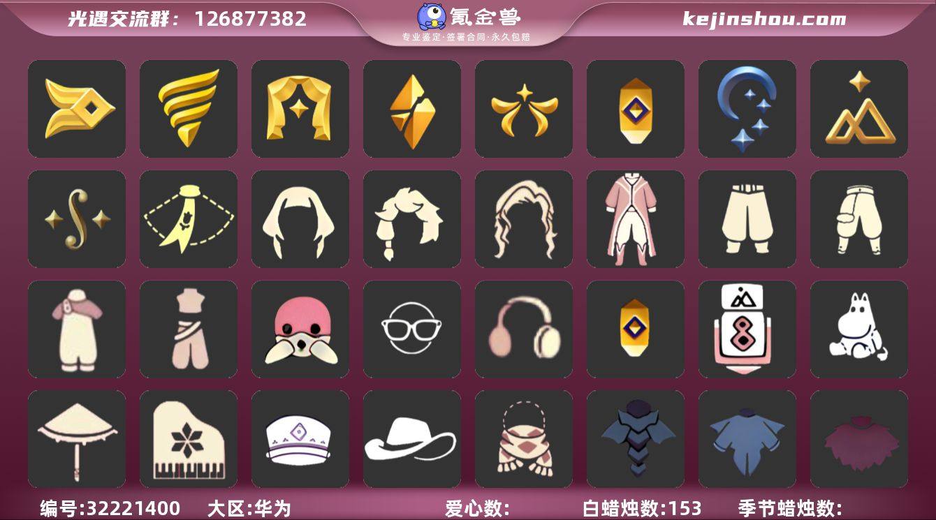 [17179775]华为 手机账号 2珍稀物品 9毕业季 4毕业图 153蜡烛 【珍稀物品】白枭(帝企鹅发),透明蝶翼斗 【季节已毕业】风行季,潜海季,表演季,破晓季,欧若拉季(欧若拉),追忆季,夜行季,拾光季,二重奏季 【完成地图】晨岛,雨林,霞谷,墓土(暮土) 【礼包】运动鞋(跃动跑鞋),南瓜(冥龙南瓜),巫师(巫师帽),绊爱(绊爱斗篷)(绊爱礼包),橘子(大橘大利),雪花(雪花发夹),兔子(玉兔头饰)(玉兔发饰)(兔子发饰),四叶草(四叶草头饰),星月头饰(星月头冠),鹿角(圣诞鹿角),创始人(创始人斗篷),蜘蛛斗(蛛丝斗篷)(蛛网斗篷) 【裤子】青鸟尊贵蓬头裤子(蓝色燕尾服),蓝绿裤(高领舞服),武士裤,背带裤,搓澡巾 【面具】黄眉企鹅面具,夜行毕业面具(棕熊面具),呼吸面具(潜水面具) 【面饰】黑框眼镜(粗框眼镜),红耳机 【项链】围巾(肩带) 【发型】单侧绑发(单边小辫),留辫蘑菇头,虚荣,若笠(箬笠) 【头饰】平顶帽,蓝色音乐会(蓝色音乐符),牛仔帽(西部帽),羽毛发饰(多羽发饰) 【斗篷】冥龙斗篷,燕尾斗篷,遥鲲斗篷(双翼遥鲲斗),粉红绒毛斗篷(绒毛斗篷),绿芽,海洋斗 【配饰】鲲灯(追忆之书),相机(季卡相机),小红伞(姆明红伞)(姆明大伞),姆明抱枕,二重奏挂画(合奏挂画),雨伞,高音钢琴(白色高脚钢琴)
