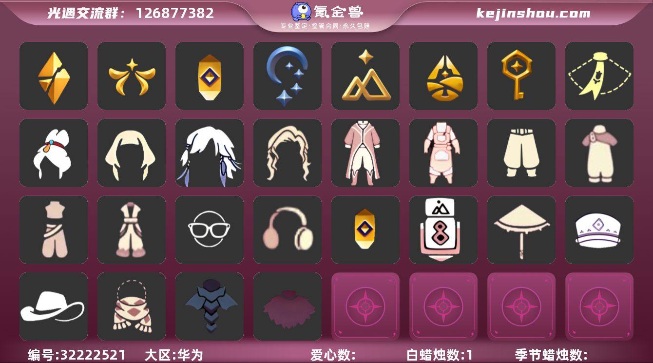 [17321413]华为 手机账号 2珍稀物品 7毕业季 2毕业图 1蜡烛 【珍稀物品】透明蝶翼斗,彩虹围巾(五塑彩带斗) 【季节已毕业】破晓季,欧若拉季(欧若拉),追忆季,夜行季,拾光季,归巢季,筑巢季 【完成地图】雨林,禁阁 【礼包】兔子鞋(兔子拖鞋),爱心眼镜,蝴蝶结(大蝴蝶结),巫师(巫师帽),绊爱(绊爱斗篷)(绊爱礼包),橘子(大橘大利),奥利奥(周年庆抱枕),兔子(玉兔头饰)(玉兔发饰)(兔子发饰),星月头饰(星月头冠),彩虹耳钉(彩虹耳饰),彩虹耳机,枯角(巫树犄角),鹿角(圣诞鹿角),欧若拉之翼,蝙蝠套(蝙蝠斗篷)(南瓜头),猫套(皮皮猫斗)(皮皮猫礼包),吉他(音韵吉他)(白吉他),小提琴(凯旋提琴),茶桌(花憩茶桌),滑板(冲浪滑板)(冲浪板) 【裤子】筑巢季·裤子(设计师长袍),青鸟尊贵蓬头裤子(蓝色燕尾服),飞天裤(柔缎花边连)(九色鹿丝带裤),蓝绿裤(高领舞服),武士裤,背带裤 【面具】夜行毕业面具(棕熊面具) 【面饰】黑框眼镜(粗框眼镜),红耳机 【项链】围巾(肩带) 【发型】留辫蘑菇头,飞天盘发(九色鹿丸子头),虚荣,归巢毕业发型(五塑彩羽发),若笠(箬笠) 【头饰】平顶帽,蓝色音乐会(蓝色音乐符),牛仔帽(西部帽) 【斗篷】冥龙斗篷,遥鲲斗篷(双翼遥鲲斗),粉红绒毛斗篷(绒毛斗篷) 【配饰】鲲灯(追忆之书),相机(季卡相机),二重奏挂画(合奏挂画),雨伞,筑巢季·小手办(光之子试衣)