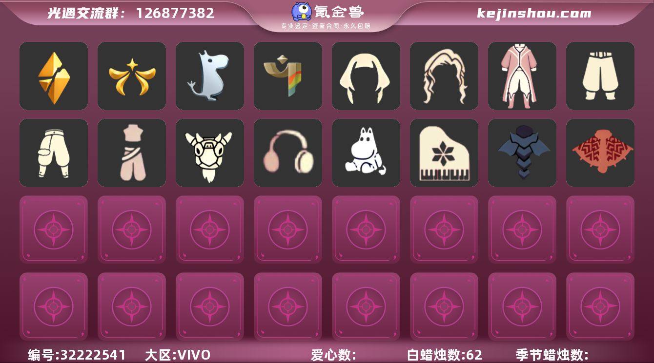 [17321948]VIVO 手机账号 1珍稀物品 4毕业季 1毕业图 62蜡烛 【珍稀物品】透明蝶翼斗 【季节已毕业】破晓季,欧若拉季(欧若拉),姆明季,彩染季 【完成地图】霞谷 【礼包】爱丽丝围裙套装礼包,运动鞋(跃动跑鞋),新年裤(瑞气服饰),姆明饰品套装(姆明尾巴),南瓜(冥龙南瓜),巫师(巫师帽),绊爱(绊爱斗篷)(绊爱礼包),星月头饰(星月头冠),新年耳钉(金鳞耳饰),鹿角(圣诞鹿角),创始人(创始人斗篷),围巾(小王子斗篷)(小王子围巾),福娃(福娃礼包)(春之日礼包)(铜钱斗),蝙蝠套(蝙蝠斗篷)(南瓜头),瑞雪(瑞雪斗篷)(暖冬瑞雪),白绒金(白雪斗篷),衔福献瑞礼包(衔福献瑞斗篷),吉他(音韵吉他)(白吉他),红伞(瑞气纸伞),献瑞折扇礼包 【裤子】青鸟尊贵蓬头裤子(蓝色燕尾服),妮妮裙子(妮妮长裙),蓝绿裤(高领舞服),武士裤,搓澡巾 【面具】辉光羚羊面具 【面饰】红耳机 【发型】留辫蘑菇头,虚荣 【斗篷】冥龙斗篷,遥鲲斗篷(双翼遥鲲斗),彩染围巾斗篷 【配饰】小红伞(姆明红伞)(姆明大伞),姆明抱枕,二重奏挂画(合奏挂画),高音钢琴(白色高脚钢琴)