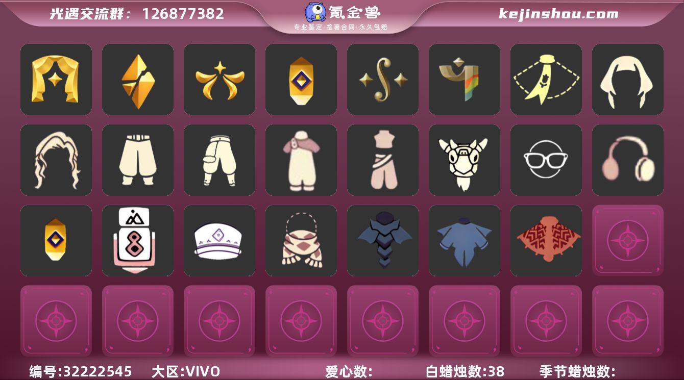[17322033]VIVO 手机账号 2珍稀物品 6毕业季 4毕业图 38蜡烛 【珍稀物品】白枭(帝企鹅发),透明蝶翼斗 【季节已毕业】表演季,破晓季,欧若拉季(欧若拉),追忆季,二重奏季,彩染季 【完成地图】晨岛,雨林,霞谷,墓土(暮土) 【礼包】兔子鞋(兔子拖鞋),运动鞋(跃动跑鞋),蝴蝶结(大蝴蝶结),巫师(巫师帽),橘子(大橘大利),雪花(雪花发夹),贝壳(贝壳发饰),兔子(玉兔头饰)(玉兔发饰)(兔子发饰),四叶草(四叶草头饰),星月头饰(星月头冠),新年耳钉(金鳞耳饰),彩虹耳钉(彩虹耳饰),创始人(创始人斗篷),围巾(小王子斗篷)(小王子围巾),红伞(瑞气纸伞),献瑞折扇礼包 【裤子】蓝绿裤(高领舞服),武士裤,背带裤,搓澡巾 【面具】黄眉企鹅面具,夜行毕业面具(棕熊面具),辉光羚羊面具 【面饰】黑框眼镜(粗框眼镜),红耳机 【项链】围巾(肩带) 【发型】留辫蘑菇头,虚荣 【头饰】平顶帽,蓝色音乐会(蓝色音乐符) 【斗篷】冥龙斗篷,燕尾斗篷,遥鲲斗篷(双翼遥鲲斗),彩染围巾斗篷 【配饰】鲲灯(追忆之书),相机(季卡相机)