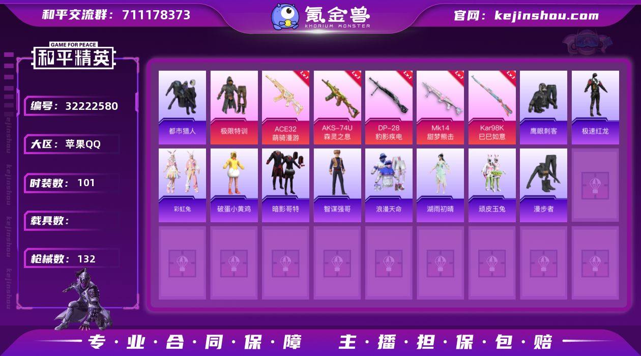 【小雾神身法 M4黄金龙骨极限特训都市猎人深海小丑鱼红眼罩浪漫天命 1粉装6特效7飞行器】苹果手Q-1粉装-6特效枪-101套装-132枪皮-6王牌印记-超级王牌-34160热力值【1粉装】极限特训【6效枪】Mk14-福马献瑞[5],Mk14-甜梦熊击[5],Kar98K巳巳如意[5],ACE32-萌骑漫游[4级],DP-28-豹影电[5],AKS-74U-森灵之息[5级]【6稀有】都市猎,浪天命,暗影哥特,深海小丑鱼,AWM-黄金龙骨,M416-黄金龙骨【7飞行器】炫彩糖果飞行器,异域银装飞行器,登顶巅峰飞行器,狂鲨锋刃飞行器,马上有福飞行器,鸡智如我飞行器,顶峰精英尾迹【2头盔】甜心宝贝头盔,金羽特工头盔【2背包】金羽特工背包,深海小丑鱼背包【220其它衣服和枪皮】云魄琉璃,暗金炫舞,蓝彩潮人,SS32特训,黄色运动,白糯汤圆,白色伏地魔,战术大师,琴音绮想,SS28特训,猎鹰,湖蓝色名流,漫步者,鹤鸣,黄色伏地魔,蓝色运动,青涩时光,森林游猎者,角色-湖雨初晴,星途旅人,智谋强哥,SS35特训,绯格组合,绮丽涂鸦,冰河战士,顶瓜瓜,狙击之神,潮流炫酷,旭日情侣,鹰眼刺客,元素星魂,福马献瑞,光之冒险,香桃花海,黑色伏地魔,异域银装,旷野奇兵,春日漫步,海岛探路者,红釉青花,炫彩糖果,雨过天青,元气之梦,暗黑骑手,画境星梦,幻影武者,夏日倾情,大橘大利,冰冻...