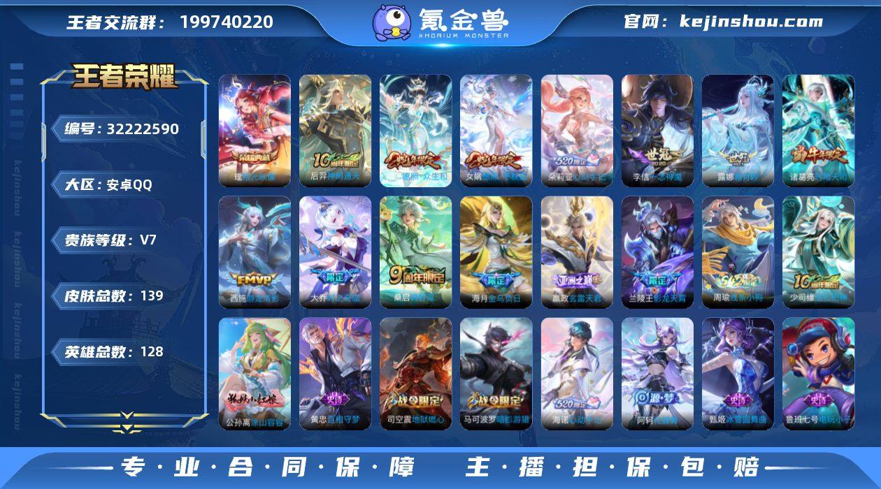 实名: 可修改 性别: 男号 贵族等级: V7 英雄数: 128 皮肤数: 139 荣耀水晶: 拾光映像 传说皮: 一念神魔,游龙清影,大乔-时之奇旅,霜月吟,金乌负日,朵莉亚心动手记,玄雷天君,神树通天 限定皮: 遇见飞天,梁祝,时雨天司,影龙天霄,鸣野蒿,愿照·千秋盛,愿照·众生和 亮点: 【优质装备】:拾光映像(瑶典藏),一念神魔,游龙清影(小青龙),大乔-时之奇旅,霜月吟,金乌负日,朵莉亚心动手记,玄雷天君,涂山容容