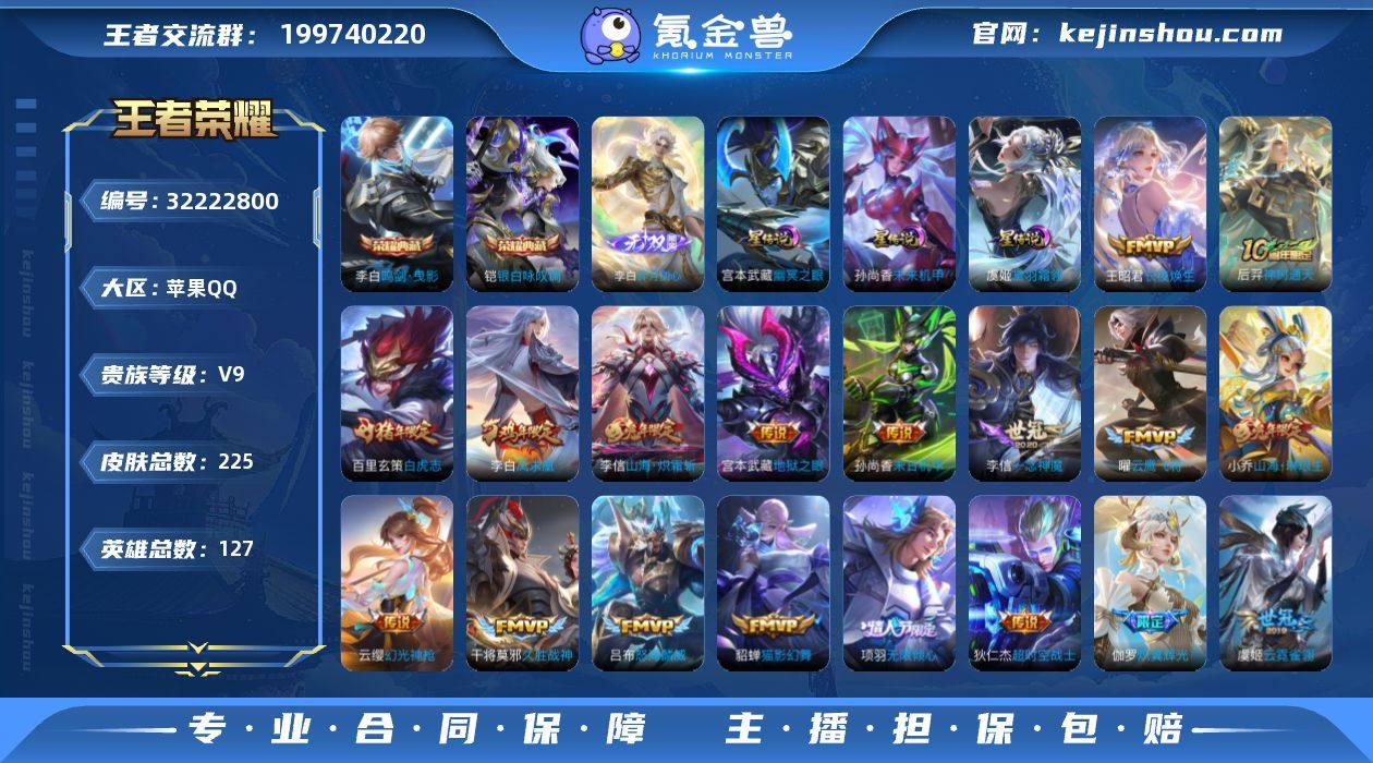 【FTWZ2】苹果Q-V9-最强王者段位-127英雄-225皮肤-2典藏皮肤-1无双-20传说-76史诗【荣耀典藏】:李白鸣剑曳影,铠银白咏叹调【无双皮肤】:李白碎月剑心【传说皮肤】:王昭君长夜焕生,后羿神树通天,云缨幻光神枪,项羽无限倾心,伽罗炽翼辉光,小乔山海琳琅生,李信山海炽霜斩,吕布怒海麟威,小乔音你心动,虞姬启明星使,曜云鹰飞将,李信一念神魔,貂蝉猫影幻舞,干将莫邪久胜战神,虞姬云霓雀翎,百里玄策白虎志,李白凤求凰,孙尚香末日机甲,宫本武藏地狱之眼,狄仁杰超时空战士【限定皮肤】:狄仁杰阴阳师,小乔山海琳琅生,赵云皇家上将,赵云龙胆,墨子神迹守卫,庄周高山流水,高渐离死亡摇滚,高渐离玩趣恶龙,元歌云间偶戏,元歌无心,典韦蓝屏警告,马可波罗暗影游猎,马可波罗山海玄木吟,狄仁杰魔术师,狄仁杰万华元夜,达摩星际陆战队,项羽海滩派对,项羽无限倾心,老夫子醍醐杖,老夫子航海奇遇记,关羽冰锋战神,程咬金演武夺筹,兰陵王金庭之子,亚瑟潮玩骑士王,孙悟空孙行者,后羿辉光之辰,后羿圣弓游侠,李元芳银河之约,李元芳云中旅人,虞姬霸王别姬,虞姬启明星使,钟馗驱傩正仪,杨戬潮玩骑兵,干将莫邪冰霜恋舞曲,干将莫邪真爱魔法,雅典娜黎明之约,蔡文姬繁星吟游,鬼谷子原初探秘者,大乔白鹤梁神女,黄忠烈魂,苏烈千军破阵,百里玄策白虎志,百里玄策原初追逐者,百里守约朱雀志,弈星混沌棋,梦奇顽趣,沈梦溪星空之诺,裴擒虎李小龙,裴擒虎擒涛扼浪,米莱狄胡桃异想国,云中君纤云弄巧,李信山海炽霜斩,伽罗炽翼辉光,猪八戒西部大镖客,上官婉儿梁祝,嫦娥拒霜思,嫦娥暖冬兔眠,鲁班大师探海日志,盘古冰霜神祇,桑启海盐诗旅,暃星界游侠,司空震地狱燃心,鬼谷子天穹祈灯,李白碎月剑心,沈梦溪龙舞盛年,鲁班七号蔬乡物语,李元芳蔬乡物语,海诺心动手记,芈月浮光...