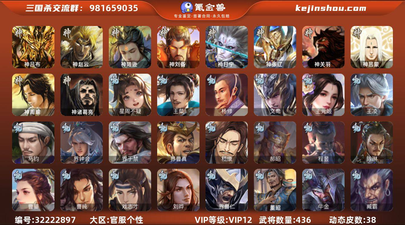 官阶:大将军;VIP等级:VIP12;史诗武将数量:69;动态皮肤数量:38;武将总数:436;史诗宝珠数量:7;将魂数量:5782;神将:7;魏国史诗武将:25;蜀国史诗武将:15;吴国史诗武将:10;群史诗武将:23