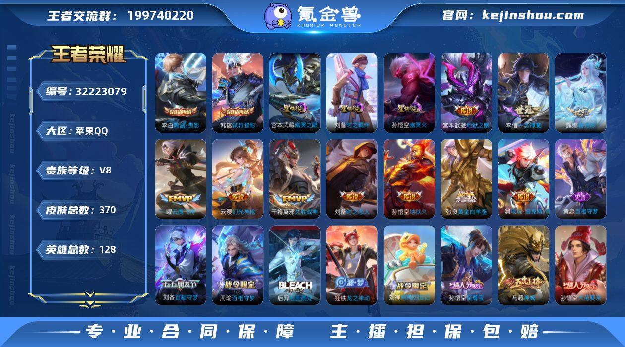 ·弑枪猎影·无相·时之羁绊·死亡执政官·愿照山河定·愿照九州拓·霜月吟·电玩雷克斯·怒海麟威·枫霜尽·云鹰飞将·凤鸣九霄天幕·可二次】w18407-苹果Q-128英雄-370皮肤-15王者印记-170铭文-贵族积分5w【贵族8】【2典藏·1无双·3星传说·17传说·2天幕·11按键】【因赛季更新游戏段付以上号为准!】 【英雄全皮】:孙权全皮,橘右京全皮,敖隐全皮,蒙恬全皮,司空震全皮,戈娅全皮,影全皮 【荣耀典藏】:李白鸣剑曳影,韩信弑枪猎影 【无双皮肤】:孙悟空无相 【星元皮肤】:宫本武藏幽冥之眼,孙悟空幽冥火,刘备时之羁绊 【天幕】:共赏芳华天幕,凤鸣九霄天幕 【传说皮肤】:大司命死亡执政官,司空震愿照山河定,澜愿照九州拓,云缨幻光神枪,桑启鸣野蒿,露娜霜月吟,澜电玩雷克斯,吕布怒海麟威,橘右京枫霜尽,虞姬启明星使,曜云鹰飞将,李信一念神魔,刘备时之恋人,张良黄金白羊座,干将莫邪久胜战神,宫本武藏地狱之眼,孙悟空地狱火 【限定皮肤】:蒙犽顽岩魄,蔡文姬夏日便利店,大乔绒语心约,虞姬夏日便利店,姜子牙天穹之誓,狄仁杰阴阳师,赵云皇家上将,墨子神迹守卫,孙尚香蔷薇恋人,鲁班七号狮舞东方,庄周高山流水,钟无艳超时空战士,扁鹊奇幻香踪,白起夜都怪侠,芈月幻夜卜梦,吕布猎兽之王,吕布御风骁将,元歌云间偶戏,元歌无心,甄姬落雪兰心,马可波罗山海玄木吟,狄仁杰魔术师,狄仁杰万华元夜,达摩星际陆战队,达摩沙漠行僧,项羽海滩派对,老夫子航海奇遇记,程咬金演武夺筹,韩信逐梦之影,韩信傲雪梅枪,王昭君午后时光,兰陵王金庭之子,橘右京枫霜尽,亚瑟潮玩骑士王,孙悟空至尊宝,孙悟空大圣娶亲,孙悟空孙行者,后羿圣弓游侠,刘备百相守梦,李元芳云中旅人,虞姬启明星使,钟馗驱傩正仪,杨戬潮玩骑兵,干将莫邪真爱魔法,雅典娜黎明之约,鬼谷子五谷丰年,黄忠火炮绅士,铠青龙...