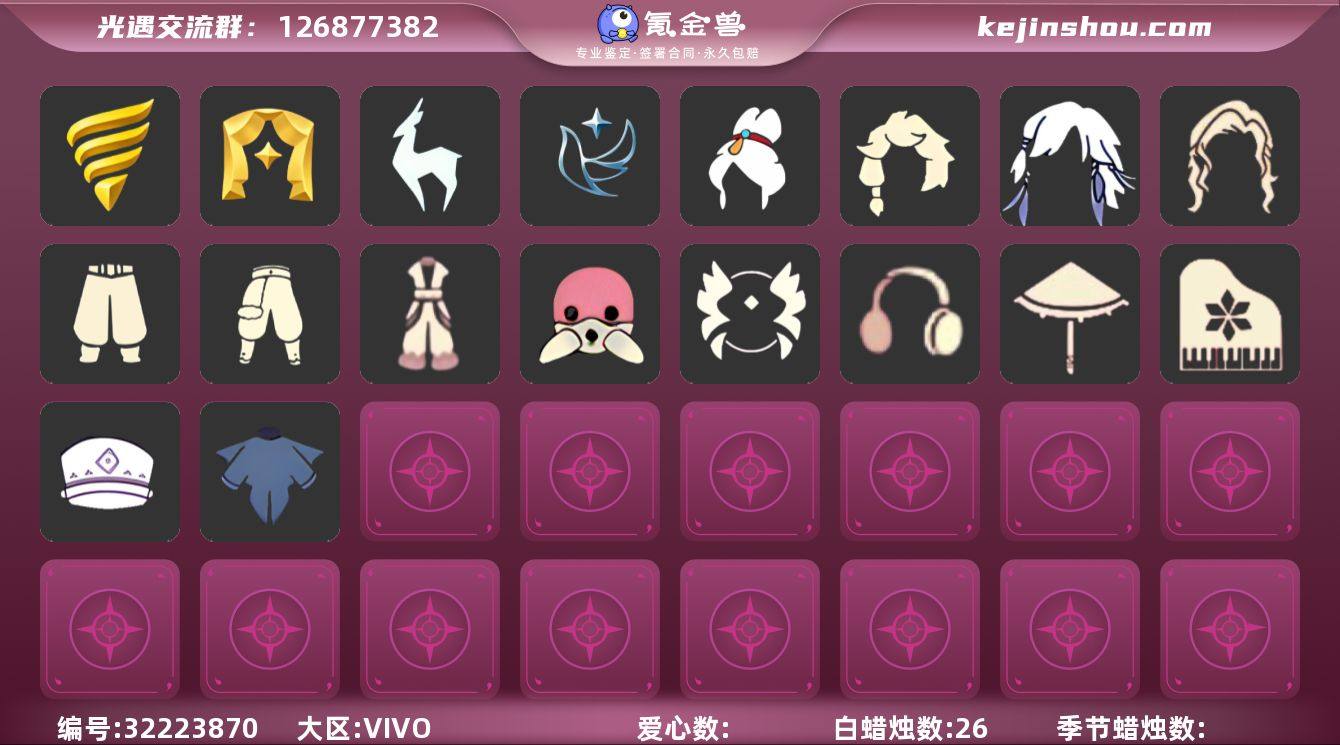 [17451578]VIVO 手机账号 1珍稀物品 4毕业季 3毕业图 26蜡烛 【珍稀物品】白枭(帝企鹅发) 【季节已毕业】青鸟季,潜海季,表演季,九色鹿(九色鹿季) 【完成地图】雨林,霞谷,墓土(暮土) 【礼包】暗彩装扮(彩虹武士裤),绊爱(绊爱斗篷)(绊爱礼包),四叶草(四叶草头饰),创始人(创始人斗篷),围巾(小王子斗篷)(小王子围巾),茶桌(花憩茶桌) 【裤子】飞天裤(柔缎花边连)(九色鹿丝带裤),武士裤,搓澡巾 【面具】黄眉企鹅面具,呼吸面具(潜水面具) 【面饰】青鸟毕业面饰(青鸟面饰),红耳机 【发型】单侧绑发(单边小辫),飞天盘发(九色鹿丸子头),虚荣,归巢毕业发型(五塑彩羽发),若笠(箬笠) 【头饰】平顶帽,蓝色音乐会(蓝色音乐符) 【斗篷】燕尾斗篷,青鸟毕业斗篷(青鸟斗篷),海洋斗 【配饰】雨伞,高音钢琴(白色高脚钢琴)