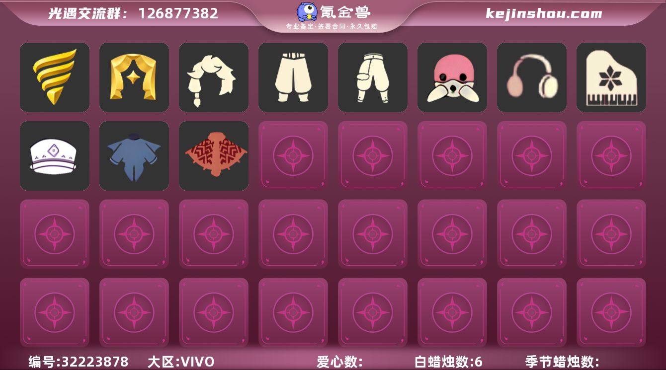 [17452073]VIVO 手机账号 1珍稀物品 2毕业季 4毕业图 6蜡烛 【珍稀物品】白枭(帝企鹅发) 【季节已毕业】潜海季,表演季 【完成地图】晨岛,云野,雨林,霞谷 【礼包】绊爱(绊爱斗篷)(绊爱礼包),橘子(大橘大利),雪花(雪花发夹),贝壳(贝壳发饰),兔子(玉兔头饰)(玉兔发饰)(兔子发饰),心心相印发饰礼包,新年耳钉(金鳞耳饰),鹿角(圣诞鹿角),创始人(创始人斗篷),福娃(福娃礼包)(春之日礼包)(铜钱斗),白绒金(白雪斗篷),吉他(音韵吉他)(白吉他),手碟(凯旋手碟),茶桌(花憩茶桌),茶壶(小憩茶桌),小船(情人小船),雪花球(雪花水晶球) 【裤子】武士裤,搓澡巾 【面具】黄眉企鹅面具,夜行毕业面具(棕熊面具),呼吸面具(潜水面具) 【面饰】红耳机 【发型】单侧绑发(单边小辫) 【头饰】平顶帽,蓝色音乐会(蓝色音乐符) 【斗篷】燕尾斗篷,彩染围巾斗篷 【配饰】高音钢琴(白色高脚钢琴)