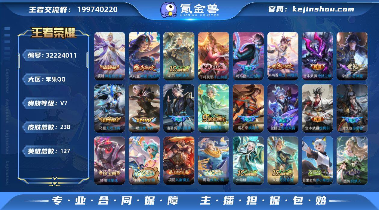 实名: 可修改 性别: 男号 贵族等级: V7 英雄数: 127 皮肤数: 238 荣耀水晶: 神鉴启示录 传说皮: 云鹰飞将,一念神魔,地狱之眼,无双飞将,鹤羽星尊,惊梅引,乘龙·问璇玑,九山相柳,千山共赴,神树通天,神骥·鸣幻洲 限定皮: 梁祝,时之彼端,枫霜尽,五谷丰年,山海·玄木吟,影龙天霄,鸣野蒿 亮点: 【优质装备】:神鉴启示录,云鹰飞将(小将军),一念神魔,地狱之眼,无双飞将,鹤羽星尊,惊梅引,千山共赴