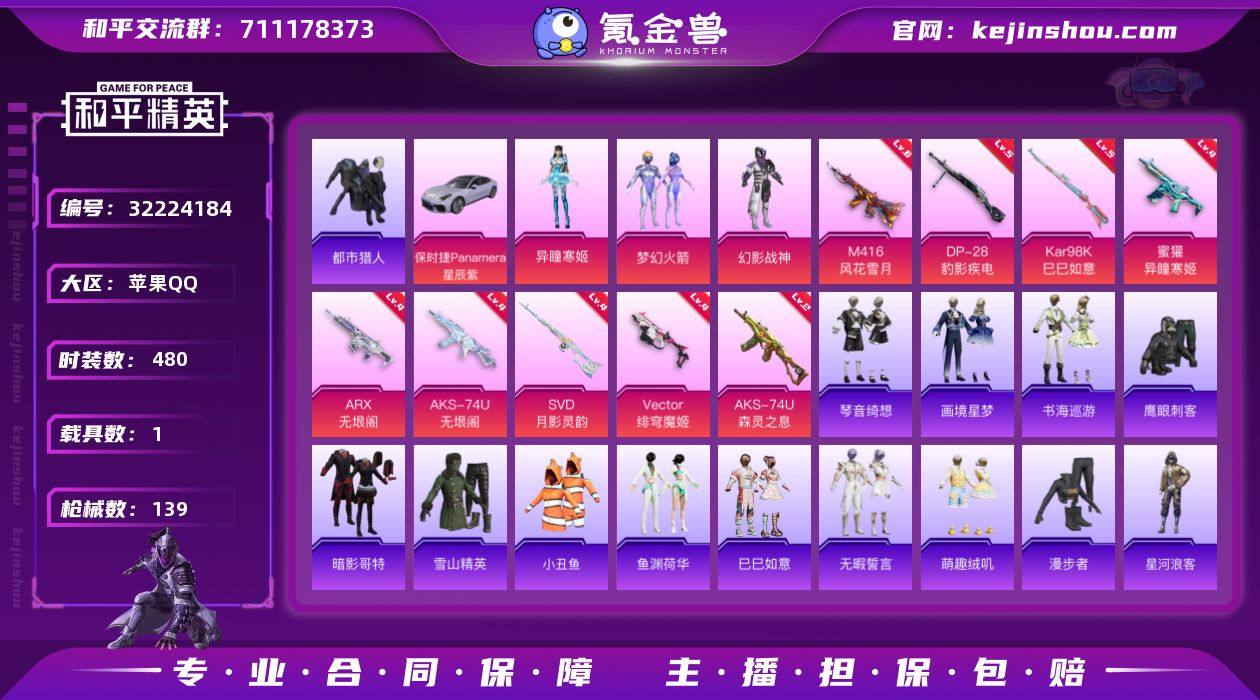 【特价出售】苹果Q-1稀有1载具3粉装13特效枪11热门109套装139枪皮 43516热力值 3印记 历史超级王牌1星 【1稀有】 都市猎人 【1载具】 保时捷Panamera(星辰紫) 【3粉装】 梦幻火箭 异瞳寒姬 幻影战神 【13特效枪】 AKS-74U-森灵之息 (2级) AKS-74U-无垠阁 (4级) Kar98K-巳巳如意 (5级) Vector-绯穹魔姬 (4级) DP-28-豹影疾电 (5级) SVD-月影灵韵 (4级) ARX-无垠阁 (4级) 蜜獾-异瞳寒姬 (4级) M416-风花雪月 (6级) AKS-74U-森灵之息 (2级) Mk14-福马献瑞 (5级) AA12-G-萌骑幻想 (1级) UMP45-萌骑冒险 (2级) 【11热门】 小丑鱼 雪山精英 鹰眼刺客 裁决冥王 暗影哥特 星河浪客 忍者信条 水银刺客 漫步者 M416-魔法学院 S686-奇异狩猎者 【1飞行器】 梦幻火箭飞行器 【3头盔】 银河战甲头盔 梦幻火箭头盔 幻影战神头盔 【2背包】 梦幻火箭背包 幻影战神背包
