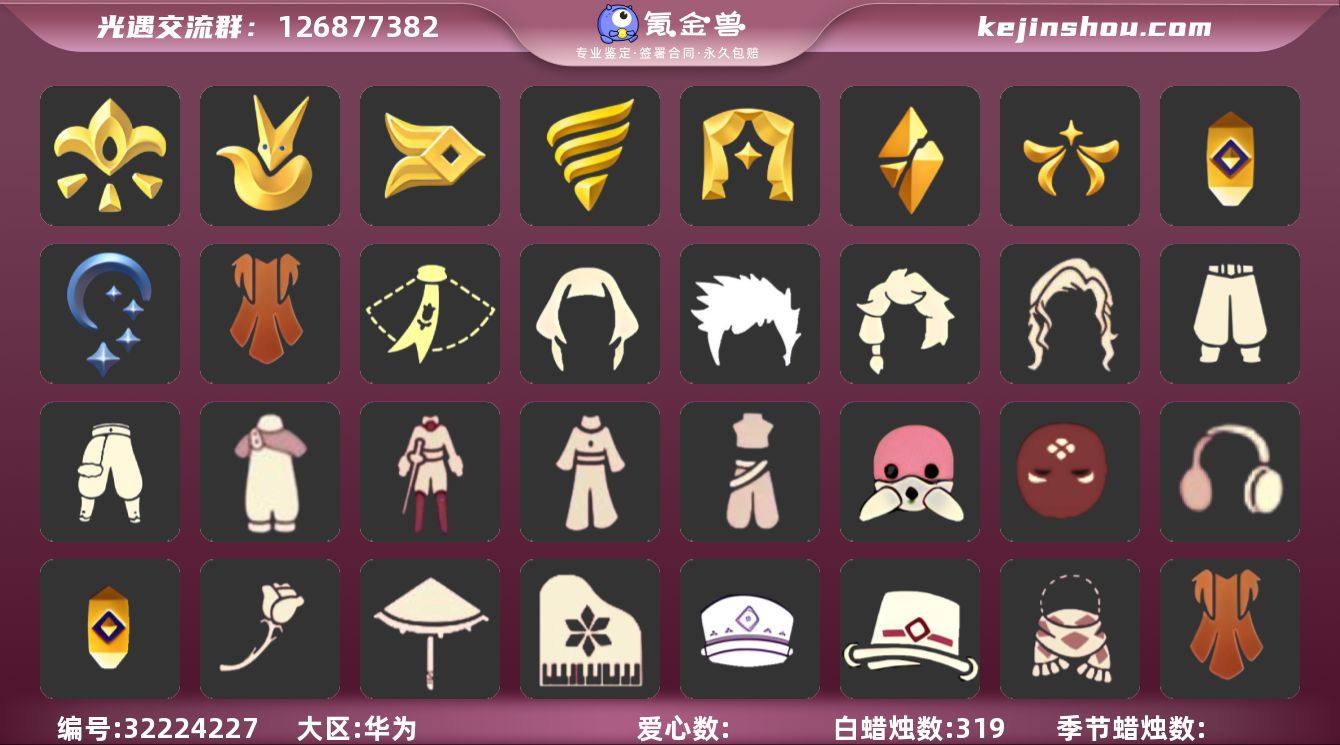 【礼包】致爱装扮(致爱打扮),新年裤(瑞气服饰),暗彩装扮(彩虹武士裤),水母(水母肩饰),奔跑发型(奔离远行发),巫师(巫师帽),绊爱(绊爱斗篷)(绊爱礼包),橘子(大橘大利),奥利奥(周年庆抱枕),雪花(雪花发夹),贝壳(贝壳发饰),兔子(玉兔头饰)(玉兔发饰)(兔子发饰),星月头饰(星月头冠),新年耳钉(金鳞耳饰),彩虹耳钉(彩虹耳饰),彩虹耳机,枯角(巫树犄角),鹿角(圣诞鹿角),创始人(创始人斗篷),围巾(小王子斗篷)(小王子围巾),欧若拉之翼,奉献斗篷,福娃(福娃礼包)(春之日礼包)(铜钱斗),海龟斗篷,蝙蝠套(蝙蝠斗篷)(南瓜头),猫套(皮皮猫斗)(皮皮猫礼包),白绒金(白雪斗篷),吉他(音韵吉他)(白吉他),人声乐器(欧若拉之声),红伞(瑞气纸伞),灯笼(中秋灯笼),黄伞(夏日阳伞),献瑞折扇礼包,秋千(情人秋千),跷跷板(情人跷跷板),茶桌(花憩茶桌),茶壶(小憩茶桌),小船(情人小船),猫背饰(猫咪背饰),雪花球(雪花水晶球)