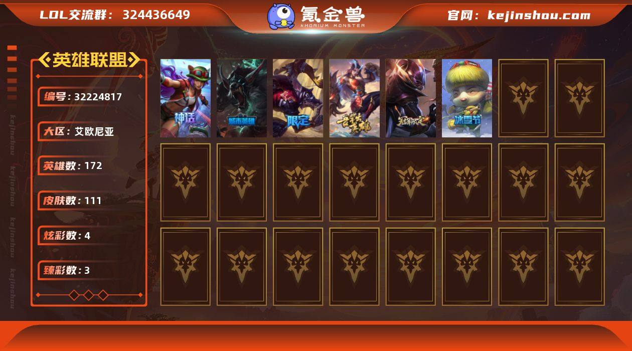 【Hyx243】电信大区艾欧尼亚-段位黄金3 【1神话 5限定 9传说 29史诗 111皮肤 4炫彩 172英雄】 可二次 优质皮肤:十五周年纪念希维尔、冠军之隐劫凯旋圣装、可爱可爱粉红红布里茨 【神话皮肤】:十五周年纪念希维尔 【臻彩皮肤】:冠军之隐劫凯旋圣装,可爱可爱粉红红布里茨 【冰雪限定】:圣诞开心鬼提莫 【限定皮肤】:FPX李青,暗影沃里克,都铎王朝图奇,玉剑传说舞龙卫 【传说皮肤】:大天使长米迦勒凯尔,钢铁之翼凯尔,恶魔男爵瑞兹,黎明使者索拉卡,约德尔国队长提莫,烈焰雄心崔丝塔娜,地狱行者孙悟空,死亡骑士盖伦,黯黑魔龙希瓦娜 【史诗皮肤】:皇家火枪手崔斯特,特战先锋赵信,翼骑统领赵信,铁钩船长费德提克,天人合一易,狼外婆沃里克,女船长厄运小姐,国王泰达米尔,刀锋女王莫甘娜,侏罗纪化石科加斯,全金属狂潮拉莫斯,夜行义贼艾瑞莉娅,穿着正装的恶魔维迦,蓝焰梦魔魔腾,死亡绽放伊莉丝,铁血猎手奈德丽,飞车暴走族古拉加斯,大夏武士潘森,侏罗纪化石克格莫,腥红之月鬼武者慎,奥术光辉拉克丝,星际迷航拉克丝,沙之守护卡兹克,刀锋女王丽桑卓,暗黑女武神黛安娜,源计划风亚索,源代码卡蜜尔,猛虎布隆,腥红之月锤石 【王者皮肤】:孤胆英豪嘉文四世 【勇士皮肤】:创意工坊黑默丁格,亮丽女神希维尔 【其他皮肤1】:幽蓝梦魇加里奥,风执事加里奥,逍遥赌侠崔斯特,深渊巨蟹厄加特,黑暗骑士阿利斯塔,部落精神瑞兹,武仙座海格力斯赛恩,原野伐木工赛恩,光明骑士希维尔,荒野巨兽努努和威朗普,脏兮兮努努和威朗普,西部牛仔厄运小姐,复仇武神贾克斯,杀戮天使昔拉莫甘娜,时间机器基兰,KDAALLOUT伊芙琳,横行霸道图奇,狂欢阿木木,王子不是我阿木木,重甲猎鹰艾尼维亚,小丑工作坊萨科,战栗之毒蒙多,嗜血行刑蒙多,绿水晶光辉塔里克,白魔法师维迦,冰壶选手维迦,垃...