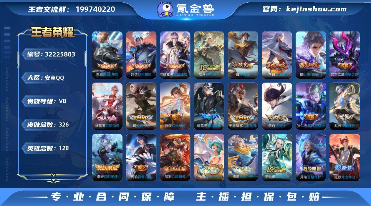 金标万战韩信可二次贵族8-326皮-3典藏-15传说-7全皮-改名卡6-灵宝改名卡1-星传说玉鸾吟-幽冥之眼-星际治安官-安卓手Q439区326皮3典藏15传说0无双V8 营地ID2112050794无双王者【荣耀典藏】:星域神启,弑枪猎影,鸣剑·曳影【优质限定皮肤】:凤求凰,至尊宝,山海·苍雷引【传说皮肤】:久胜战神,神树通天,凤求凰,地狱之眼,启明星使,云鹰飞将,山海·苍雷引,超时空战士,音你心动,淬星耀世,诗剑行,鹤羽星尊,武陵仙君,幻光神枪,李逍遥 【史诗皮肤】:功夫厨神,星夜王子,线条小狗,九幽镇关,荣光圣徽,巫礼祀神,云间偶戏,百相守梦,龙之律动,驭风魔法,龙骑士,引擎之心,修罗,唐三藏,电玩·爆裂旋风,凤凰于飞,奇幻香踪,鬼剑武藏,圣诞狂欢,至尊宝,电玩小子,暗夜贵公子,曙光守护者,玫瑰异探,暗夜猫娘,白蛇,顽趣,苍穹之光,星界游侠,水果甜心,幽灵船长,魅语,飞衡,猫狗日记,紫霞仙子,超时空战士,无心,狂想玩偶喵,李小龙,黎明之约,冰冠公主,电玩高手,茶境仙,原初追逐者,吟游魔法,魔法小厨娘,高山流水,火炮绅士,未来纪元,无限星赏官,化蝶舞,节奏热浪,绅士熊喵,金属风暴,暗隐猎兽者,逐浪之夏,特工魅影,末日机甲,女仆咖啡,谪仙醉月,冰雪圆舞曲,傲雪梅枪,黄金分割率,白龙吟,心灵战警,青蛇,蔷薇恋人,逐梦之影,偶像歌手,鹰眼统帅,魔术师,皇家上将,航海奇遇记,真爱魔法,魅力维加斯,暗影游猎,德古拉伯爵,水晶猎龙者,圣诞恋歌,乱世虎臣,千年之狐,乘风破浪,拒霜思,决胜骁骑,摇滚巨星,猪悟能