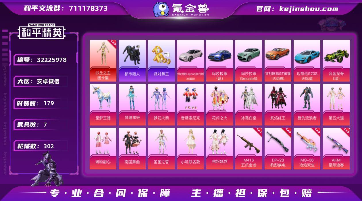 安卓 微信-1神装-13粉装-20特效枪-7载具-6粉色飞行器-110112热力值-18王牌印记-179套装-302枪皮 【红色神装等级】:沙丘之主-图卡盟(五级) 【红色角色神装】:沙丘之主-图卡盟 【热门品类】:粉装-梦幻火箭,粉装-音爆索尼克,套装-都市猎人,套装-派对舞王,套装-小丑鱼,角色-军刀雅典娜,套装-龟仙人,套装-粉红小猪,套装-红红火火,角色-Mark.06,大砍刀-青龙偃月刀,撬棍-龙胆亮银枪 【粉色套装】:粉装-梦幻火箭,粉装-花间之火,粉装-冰霜白皇,粉装-炙焰红王,角色-复仇流浪者,粉装-音爆索尼克,粉装-第五大道,粉装-飒粉甜心,粉装-南国舞曲,角色-圣堂之誓,角色-小叽联名款,粉装-桃粉嫣然,角色-异瞳寒姬 【粉色枪皮等级】:AKM-星际浪客(五级),SCAR-L-青春物语(五级),M416-五爪金龙(七级),GROZA-巴啦啦小魔仙(五级),AUG-超新星(五级),蜜獾-异瞳寒姬(一级),ACE32-萌骑漫游(二级),UMP45-相思残雪(五级),Vector-环太平洋(五级),AKS-74U-森灵之息(五级),P90-沙丘之主(三级),Kar98K-巳巳如意(五级),Mk14-福马献瑞(五级),AMR-智耀战神(五级),AA12-G-萌骑幻想(一级),M249-猪猪侠(五级),DP-28-豹影疾电(五级),PKM-萌骑夺宝(一级),MG-36-沧焰双生(五...