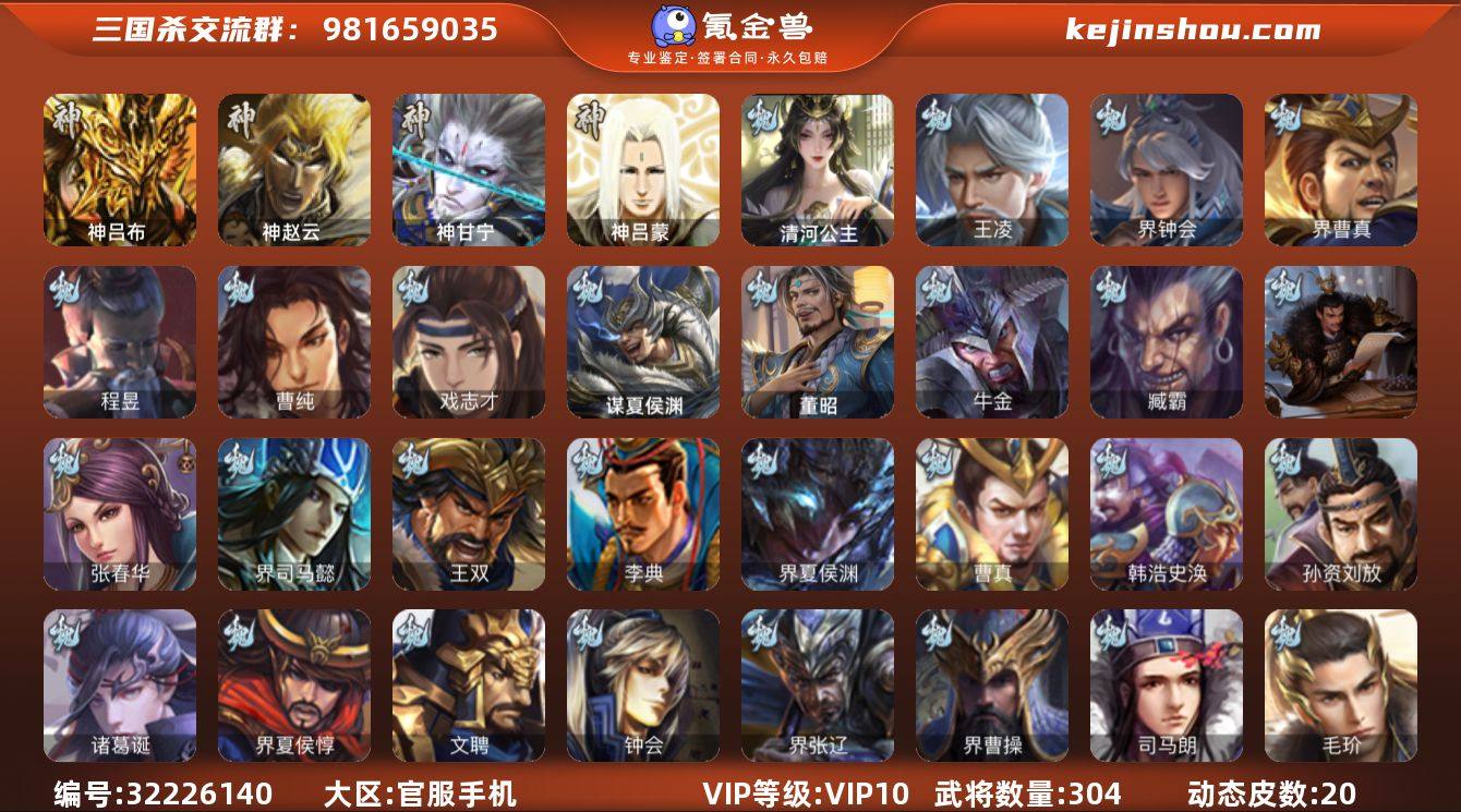 官阶:骠骑将军;VIP等级:VIP10;史诗武将数量:27;动态皮肤数量:20;武将总数:304;史诗宝珠数量:0;将魂数量:2449;神将:3;魏国史诗武将:15;蜀国史诗武将:2;吴国史诗武将:4;群史诗武将:12
