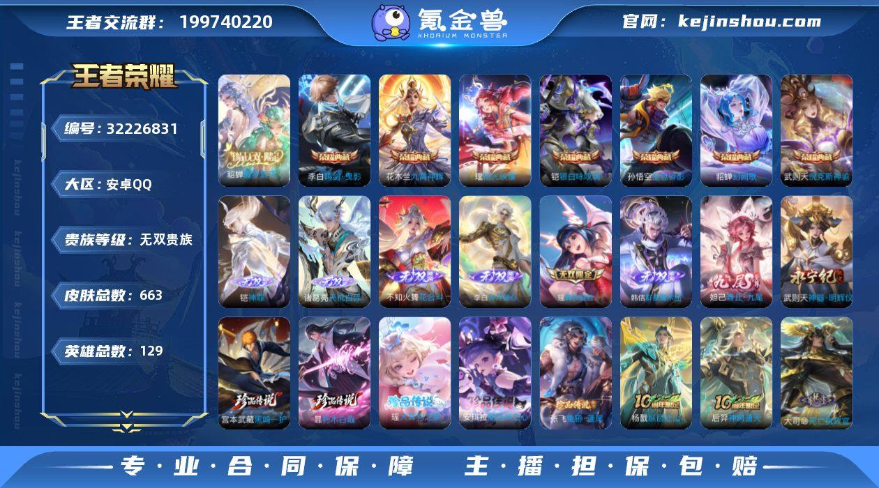 实名: 可修改 性别: 女号 贵族等级: 无双贵族 英雄数: 129 皮肤数: 663 荣耀水晶: 武则天,倪克斯神谕,鸣剑·曳影,全息碎影,九霄神辉,银白咏叹调,幻阙歌,拾光映像 无双皮: 真我赫兹(瑶),神器·明辉仪,青丘·九尾,碎月剑心,韩信群星魔术团,花合斗,天机白泽,神罪 珍品传说: 兔狲·蓬尾,酷洛米之心,大耳狗之梦,朽木白哉,黑崎一护 传说皮: 黄金狮子座,黄金射手座,冠军飞将,云鹰飞将,绛天战甲,黄金白羊座,猫影幻舞,久胜战神,炽阳神光,一念神魔,云霓雀翎,末日机甲-孙尚香,地狱火,仲夏夜之梦,音你心动-小乔,零号·赤焰,海洋之心,地狱之眼,飞鸢探春,音你心动-周瑜,胖达荣荣,李逍遥,乞巧织情,时之恋人-刘备,游龙清影,淬星耀世,超时空战士-狄仁杰,末日机甲-孙策,花朝如约,挚爱之约,挚爱花嫁,无双飞将,音你闪耀,碎云,天秀幻梦,神器·狴犴令,神器·明辉仪,山海·炽霜斩,山海·琳琅生,山海·苍雷引,炽翼辉光,燃星之曲,画中仙,浮生妄,记忆之芯,青丘·九尾,百相守梦(张飞),追逃游戏(亚瑟),追逃游戏(安琪拉),电玩·雷克斯,鹤羽星尊,灼幽烈阳,妄想实况,妄想奇谈,鹤归松栖(云缨),惊梅引,遇见神鼓,鲁班七号-时之奇旅,大乔-时之奇旅,永恒水手月亮,夜礼服假面,小动物乐团,霜月吟,澜逐花归海,艾琳觅芳踪,琥珀纪元铠,琥珀纪元马超,乘龙·问璇玑,乘龙·铭钟鼎,乘龙·淬吴钩,貂蝉曦玄引,吕布曦玄引,典韦战鼓燎原,落雪白狼,金乌负日,黄金天蝎座,云中君群星魔术团,朵莉亚心动手记,铠冥王哈迪斯,牧神诗旅,玄雷天君,幻光神枪,祥瑞亨通,星之鸣奏,续相思,云诺千山,九山相柳,死亡执政官,神树通天,纵目迁山 限定皮: 冰锋战神,遇见飞天,李小龙,祈雪灵祝,游园惊梦,梁祝,御风骁将,云端筑梦师,时雨天司,引擎之心,龙胆,白鹤梁神女,武圣,魔法小厨娘,辉光之辰,白晶晶,岱宗,天狼溯光者,虎魄,天魔缭乱,神威,蜜橘之夏,永曜之星,时之彼端,奇迹圣诞,飞衡,乒乒小将,太华,天狼征服...