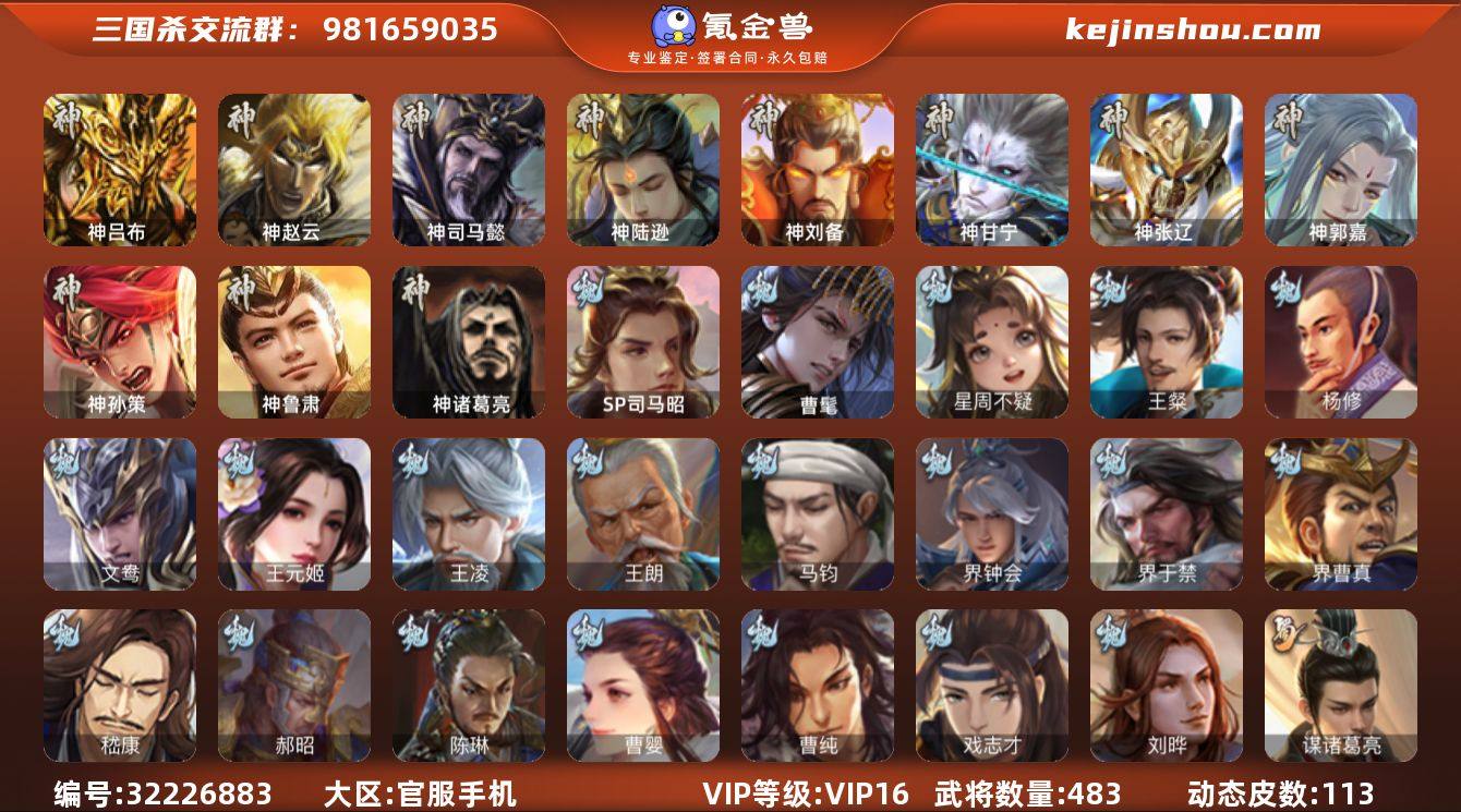 【2461】官阶:大将军;VIP等级:VIP16;史诗武将数量:91;动态皮肤数量:113;武将总数:483;史诗宝珠数量:41;将魂数量:15678;神将:14;魏国史诗武将:75;蜀国史诗武将:16;吴国史诗武将:13;群史诗武将:36 神吕布,神赵云,神司马懿,神陆逊,神刘备,神甘宁,神张辽,神郭嘉,神孙策,神关羽,神吕蒙,神周瑜,神诸葛亮,神鲁肃,SP司马昭,曹髦,星周不疑,王粲,杨修,文鸯,王元姬,王凌,王朗,魏-司马昭,马钧,界钟会,界于禁,界曹真,嵇康,郝昭,陈琳,曹婴,曹纯,戏志才,刘晔,关索,谋诸葛亮,马云騄,谋赵云,谋马超,诸葛瞻,周群,赵襄,张星彩,王平,沙摩柯,谯周,界黄忠,花鬘,董允,鲍三娘,张奋,谋黄盖,周处,吴景,孙皓,骆统,留赞,界朱然,界徐盛,界步练师,贺齐,势陆郁生,势太史慈,谋郭嘉,谋黄月英,谋荀彧,十常侍,裴秀,左慈,张让,张琪瑛,星黄忠,星甘宁,王允,陶谦,苏飞,司马徽,审配,麹义,庞德公,南华老仙,祢衡,刘焉,沮授,界左慈,界李儒,公孙康,杜预,陈登,卑弥呼,鲍信,谋张角,张绣,李傕,阎象,许攸,友徐庶,友诸葛亮,星董卓,神鲁肃-九州为局,神郭嘉-虎年清明(动态),神太史慈-勇撼日月(动态),神孙策-霸王再世(动态),神甘宁-万人辟易(动态),神陆逊-绽焰摧枯(动态),神吕蒙-兼资文武(动态),神周瑜-陵光引灵(动态),神诸葛亮-观星唤雨,神诸葛亮-孟章诛邪(动态),神曹操-天下归心,神曹操-玄天通冥(动态),神吕布-监兵噬魅(动态),神赵云-战龙在野(动态),神司马懿-鉴往知来(动态),鲍三娘-情定缘起,SP司马昭-鼠年冬至(动态),郭嘉-以身证道(动态),星周不疑-才广志宏(动态),曹植-龙年中秋(动态),钟会-潜蛟觊天(动态),曹丕-气荡山河(动态),甄姬-明珠耀躯(动态),曹叡-睥睨天下(动态),SP蔡文姬-兔年冬日(动态),荀攸-妙策助军(动态),甄姬-洛水神韵(动态),曹丕-猪年端午(动态),曹丕-牛年清明(动态),张郃-背水一战(动态),邓艾-神兵天降(动态),王基-独秉固志(动...