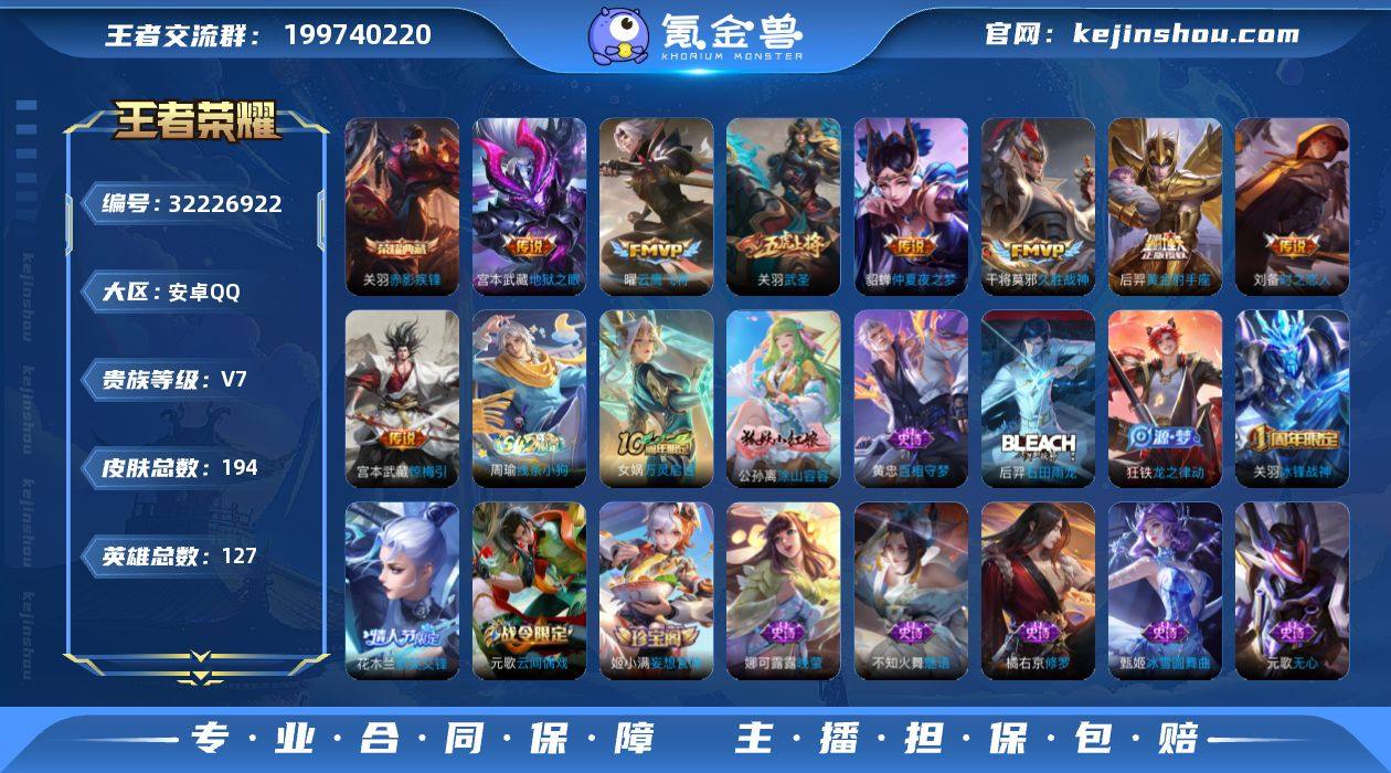 贵族7/皮肤194/典藏1/传说9/史诗64/英雄127/金标关羽/关羽全皮/孙权全皮/赤影疾锋/关羽神骥镇沧海/惊梅引/武圣/云鹰飞将/时之恋人-刘备/久胜战神/黄金射手座/仲夏夜之梦/地狱之眼/阴阳师/皇家上将/神迹守卫-墨子/蔷薇恋人/高山流水/云间偶戏/无心/游园惊梦/魔术师/万华元夜(s22)/星际陆战队-达摩/海滩派对/航海奇遇记/冰锋战神/百相守梦(关羽)/演武夺筹(s23)/默契交锋-花木兰/潮玩骑士王/圣弓游侠/云中旅人(s29)/驱傩正仪(s24)/遇见飞天/真爱魔法/黎明之约/千军破阵(s25)/原初追遂者/顽趣-梦奇/擒涛扼浪(s31)/胡桃异想国/纤云弄巧/拒霜思/玲珑珍味/探海日志(s32)/海盐诗旅(s30)/驭风魔法/江河有灵/古海寻踪(s33)/百解令(蒙犽)/蒙恬荣光圣徽/高渐离燃音魔法/妲己灵卜魔法/鬼谷子天穹祈灯(S34)/琥珀纪元伽罗/妄想食味/龙武盛年/剑破天穹(s35)/程咬金群星魔术团/决胜骁骑/刘备异域游侠/熔金海岸/逆浪荇歌/荣光之誓/星界战将/线条小狗-周瑜/万灵启世/涂山容容/百相守梦-黄忠/石田雨龙/龙之律动/怒海争锋/永昼/乐园奇幻夜/天秀·启明/修罗/魅语/白蛇/晚萤/鹰眼统帅/星夜王子/功夫厨神/逐浪之夏/特工魅影/心灵战警/暗隐猎兽者/缤纷独角兽/乘风破浪/德古拉伯爵/末日机甲-吕布/千年之狐/幽灵船长/绅士熊喵/圣诞狂欢/金属风暴/魅力维加斯/水果甜心/鬼剑武藏/偶像歌手/冰雪圆舞曲/圣诞恋歌/未来纪元-赵云/吕布舞狮寰/兰陵王雾影缉谜/溯影追猎/极光幻客/鹤鸣心笺/径山谋武/罗小黑战记/克喵/踏浪烽翎/锦麟游梦/云械蓝图/死霸装/星梦巡礼/长夏之忆/暗都幽影/经纬探寻者/无尽旅途/春野之旅/亚瑟鸿运当头/朵莉亚金色潮汐/时空谍影/暖冬絮语(程咬金)/完美运算/决胜大满贯/幻夜行动/破局者/王牌新星/聚星闪耀/热血海滩/妄想特派/零食大作战/劲辣红锅/潮玩探月行/幻泉雾影-海月/危途狂花/潮玩造梦师/无双福将/潮玩牛仔/铁甲之心/乓乓...