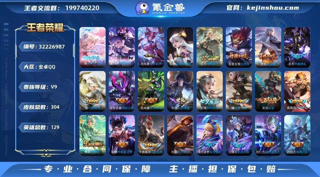 贵族等级:V9 典藏皮肤数:0 珍品无双皮肤数:0 无双皮肤数:0 珍品传说皮肤数:2 传说皮肤数:25 史诗皮肤数:81 皮肤数:304 英雄数:129 段位:钻石 卖家说:你们自己看吧