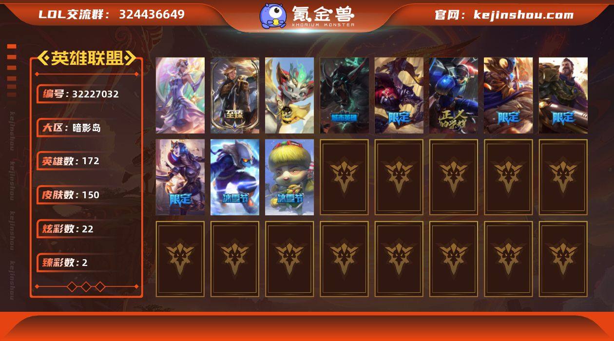 【LOLZ1311】172英雄/150皮肤/1终极/2神话/10限定/2臻彩/22炫彩/18传说/41史诗/未定级/10周年庆典 凤凰/至臻 灵能特工 伊泽瑞尔/源计划: 火 菲奥娜 惩戒/魔女 阿卡丽 虚荣/天龙之子 斯莫德/圣诞开心鬼 提莫/冰雪节 炼金/冰雪节 马尔扎哈/大元素使/胜利之树 茂凯/胜利枪神 格雷福斯/胜利女神 奥莉安娜/暗影 沃里克/都铎王朝 图奇/防暴天使 凯尔/烈焰雄心 崔丝塔娜/幻灵战斗队长 厄运小姐/女皇 艾希/源计划:联合 艾希/恶魔之刃 泰达米尔/鬼魂新娘 莫甘娜/律政大亨 蒙多/最终BOSS 维迦/太空律动 “猫猫” 布里和里茨/第三类接触 黑默丁格/钢铁军团 盖伦/神王 盖伦/黯黑魔龙 希瓦娜/冰霜亚龙 希瓦娜/焰尾妖狐 阿狸/泳池派对 吉格斯/神王 德莱厄斯/神龙尊者 昼日真龙 亚索/安伯斯与提妮/翼骑统领 赵信/战场公主 希维尔/圣洁化身 索拉卡/兔宝宝 提莫/少林武僧 贾克斯/飞越疯人院 萨科/夜刃 艾瑞莉娅/寒冰女皇 迦娜/血石诅咒 塔里克/穿着正装的恶魔 维迦/北领前线 斯维因/霸天巨兽 墨菲特/暗夜猫女 卡特琳娜/前线指挥官 卡特琳娜/符文战神 雷克顿/死亡绽放 伊莉丝/三昧真火 孙悟空/斗战胜佛 孙悟空/冰晶之核 布兰德/防弹武僧 李青/屠龙勇士 薇恩/深海妖姬 卡西奥佩娅/法老王朝 内瑟斯/军神战甲 波比/大夏武士 潘森/腥红之月 凯南/钢铁烈阳 蕾欧娜/至高君王 玛尔扎哈/腥红之月 泰隆/ODST 地狱伞兵 拉克丝/钢之逆鳞 希瓦娜/源计划:火 菲奥娜/铁血帝皇 德莱厄斯/腥红之月 黛安娜/野火之藤 婕拉/源计划: 风 亚索/黑帮狂花 金克丝/冲击之刃 劫/源计划:阴 劫/炼狱魔女 蔚/星空之门内瑟斯/死亡骑士内瑟斯/战地之王加里奥/亮丽女神希维尔/探戈灵魂崔斯特/奥德赛崔斯特/潮流女王乐芙兰/五杀摇滚女声主唱凯尔/暗影易/星战易/荒野镖客阿利斯塔/武仙座海格力斯赛恩/军情五处提莫/约德尔海贼团崔丝塔娜/荒野巨兽努努和威朗普/脏兮兮努...