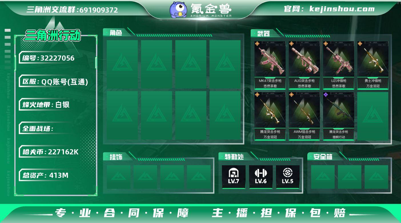 "YXB-纯绿无封-227162k哈伏币-总资产413m流动资产400m-60烽火等级-白银-1战场等级-无军衔 部门12221特勤处仓库7训练中心6靶场5 【近战皮肤】:近战-黑鹰 【史诗外观】:腾龙突击步枪-猎鳄行动 【稀有外观】: AK-12突击步枪-马年新春,SCAR-H战斗步枪-荣耀列队,MP5冲锋枪-哈夫克卫队,SMG-45-行动开启,QJB201轻机枪-哈夫克卫队 【普通外观】:SMG-45冲锋枪-斑马,QBZ95-1突击步枪-海浪,K416突击步枪-几何迷彩,K416突击步枪-高雅黑,M16A4突击步枪-高雅黑,AUG突击步枪-浅蓝涂装,M7战斗步枪-红色涂装,SCAR-H战斗步枪-数码迷彩,UZI冲锋枪-海色,野牛冲锋枪-高雅黑,M1014霰弹枪-高雅黑,M1014霰弹枪-海浪,M1014霰弹枪-重击,QJB201轻机枪-典雅,SV-98狙击步枪-红色涂装,沙漠之鹰-高雅黑 【挂饰】:挂饰-麻将 "