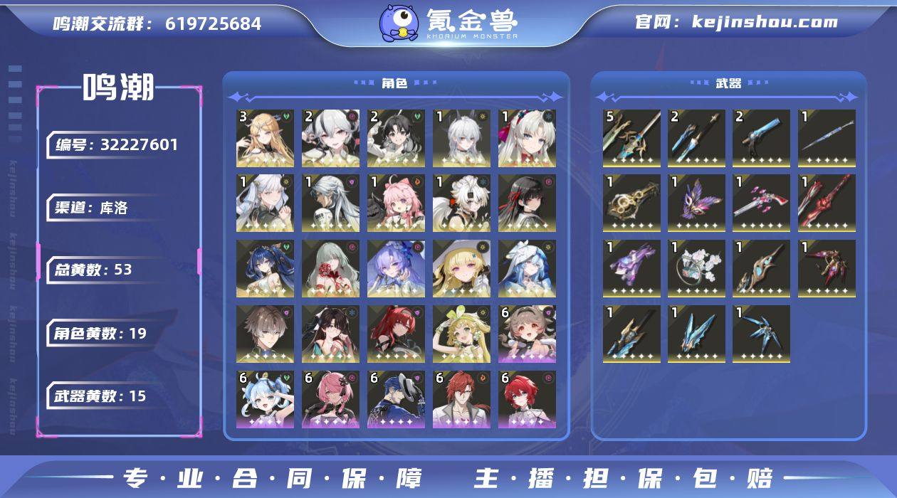 鸣潮毕业号,3命卡提2命椿,主c全专武,游戏没压力,买鸣潮号附带一个战双号,热门角色都有