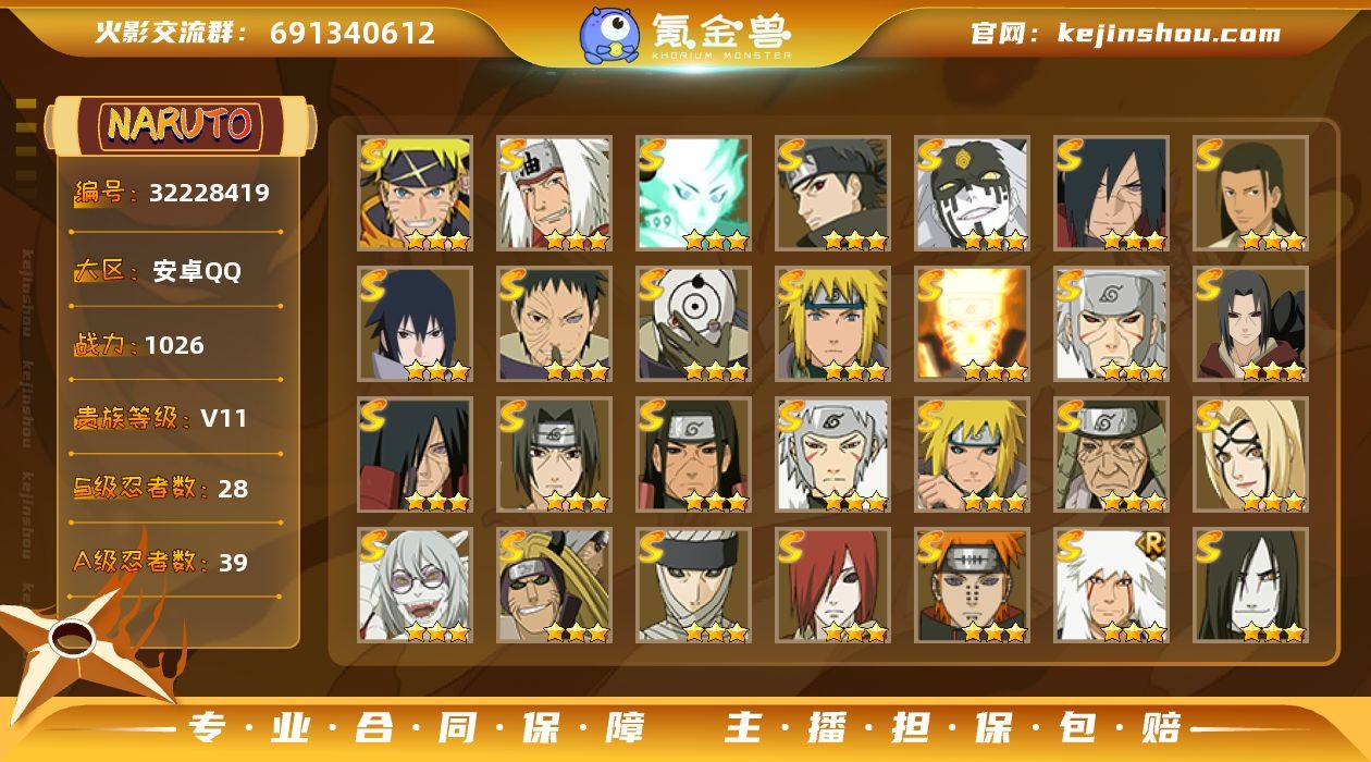 0B7H86 号 VIP11,1026W战力,S忍28个,A忍41个,本服前1000,战区未上榜,通灵兽20个,6时装,点券5,金币58,高招券0,影级2阶,忍者星数538