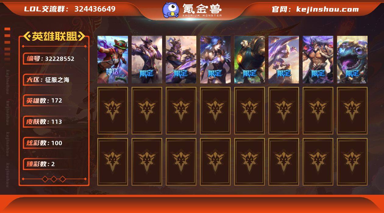 【LOLYH1677】172英雄/113皮肤/1神话/12限定/2臻彩/100炫彩/8传说/25史诗/大师/十五周年纪念 希维尔/冠军之志 瑞兹 凯旋圣装/西部魔影 执行人 卡特琳娜 纯洁/夺命美人 卡特/圣诞老人 酒桶/暗裔英雄 盖伦/胜利机器人 布里茨/胜利凤凰 艾尼维亚/胜利之王 泰达米尔/胜利巨口 克格莫/胜利女神 娑娜/胜利剑圣 易/胜利之运 崔斯特/胜利女神-菲奥娜/战场女武神 凯尔/墨之影武者 易/烈焰雄心 崔丝塔娜/黯晶凤凰 艾尼维亚/源计划:净化 薇恩/偶像歌手 阿狸/星之守护者 金克丝/真实伤害 艾克/铁血剑豪 易/紫晶射手 艾希/死神 卡尔萨斯/卡尔萨斯·祸害之光/小小骑士 阿木木/夜刃 艾瑞莉娅/夜行义贼 艾瑞莉娅/绝代智将 斯维因/古墓丽影 凯特琳/暗夜猫女 卡特琳娜/屠龙勇士 薇恩/大夏武士 潘森/银色之牙 阿卡丽/刺客信条 锐雯/沙之守护 泽拉斯/黑帮教父 格雷福斯/海牛猎手 菲兹/银河魔装机神 菲兹/夜鸦 菲奥娜/铁血帝皇 德莱厄斯/生化骑士 德莱厄斯/源代码 卡蜜尔/黯焰双魂 千珏/银河魔装机神千珏/霸天剑魔 亚托克斯/赵云子龙/电锯狂人厄加特/学生会长弗拉基米尔/腥红之月易/约德尔海贼团崔丝塔娜/青花瓷厄运小姐/宗师级钓鱼训练师贾克斯/光明骑士贾克斯/黑暗女王伊芙琳/假面女皇伊芙琳/首领图奇/自由女神卡尔萨斯/山海绘卷科加斯/联盟之喙艾尼维亚/万能小丑萨科/源计划正义艾瑞莉娅/玉剑传说风仙子/沙之守护迦娜/光明骑士卡尔玛/冰壶选手维迦/狼神英灵卡特琳娜/银河魔装机神伊莉丝/黑色玫瑰假面舞会伊莉丝/狮子星神奈德丽/这货不是乌迪尔/万人敌潘森/英仙座珀尔修斯潘森/未来战士潘森/源计划暗影阿卡丽/荣誉使者玛尔扎哈/西部魔影猎天使恶魔泰隆/灵魂莲华锐雯/光明哨兵锐雯/荣誉使者慎/战斗学院拉克丝/KDAALLOUT阿狸/雷喵喵尔/韦鲁斯迅箭/源计划天眼韦鲁斯/玉剑传说无双/未来战士菲奥娜/胜利女神菲奥娜/灵魂收割者德莱文/泳池派...