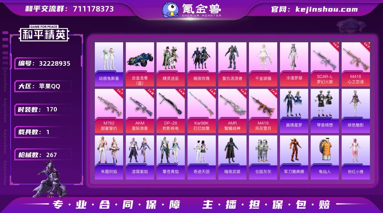 【特价出售/店主推荐】 苹果 手Q-5粉装-10特效枪-1载具-5粉色飞行器-87357热力值-16王牌印记-170套装-267枪皮 【热门品类】:角色-军刀雅典娜,套装-动感兔斯基人偶服,套装-龟仙人,套装-粉红小猪,角色-Mark.06 【粉色套装】:粉装-精灵迷巫,粉装-暗夜玫瑰,角色-复仇流浪者,角色-千金淑猫,角色-冷漠罗丽 【粉色枪皮等级】:AKM-星际浪客(六级),SCAR-L-梦幻火箭(七级),M416-心之恋语(七级),M416-风花雪月(三级),M762-甜蜜誓约(七级),Kar98K-巳巳如意(五级),Mk14-福马献瑞(五级),AMR-智耀战神(五级),DP-28-豹影疾电(五级),PKM-萌骑夺宝(三级) 【粉色载具】:合金龙骨(蓝) 【粉色枪皮】:AKM-星际浪客,SCAR-L-梦幻火箭,M416-心之恋语,M416-风花雪月,M762-甜蜜誓约,Kar98K-巳巳如意,Mk14-福马献瑞,AMR-智耀战神,DP-28-豹影疾电,PKM-萌骑夺宝 【粉色飞行器】:炫彩糖果飞行器,春暖花开飞行器,梦幻火箭飞行器,古堡领主飞行器,时光之誓飞行器 【粉色降落伞】:雪国幻梦降落伞,春暖花开降落伞,梦幻火箭降落伞,神秘黑猫降落伞,古堡领主降落伞,甜蜜誓约降落伞,四圣焕新降落伞,星之彼岸降落伞,环太平洋降落伞,仲夏莫吉托降落伞,萌物绒绒降落伞,幻影飞狐降落伞,雪月幻音降落伞,星穹咏叹调降落伞,时光之吻降落伞,冷漠罗丽降落伞,智趣喵喵降落伞,无垠阁降落伞,炫彩糖果降落伞 【稀有套装】:套装-龟仙人,套装-雪国风尚,套装-马上有钱,套装-糖糖葫芦,套装-青团波波,套装-粉恋花,套装-紫幽梦,套装-蓝冰羽,套装-星影赞美诗,套装-星渊小夜曲,套装-彩虹兔,套装-云朵鹅,套装-雪绒豹,角色-时希公主,角色-夜瞳黯灵,套装-朱霞炽焰,套装-凌霄紫焰,套装-擎苍青焰,角色-绯色魅影,套装-画境星梦,套装-琴音绮想,套装-雨过天青,套装-红釉青花 【稀有枪皮】:AKM-四圣焕...