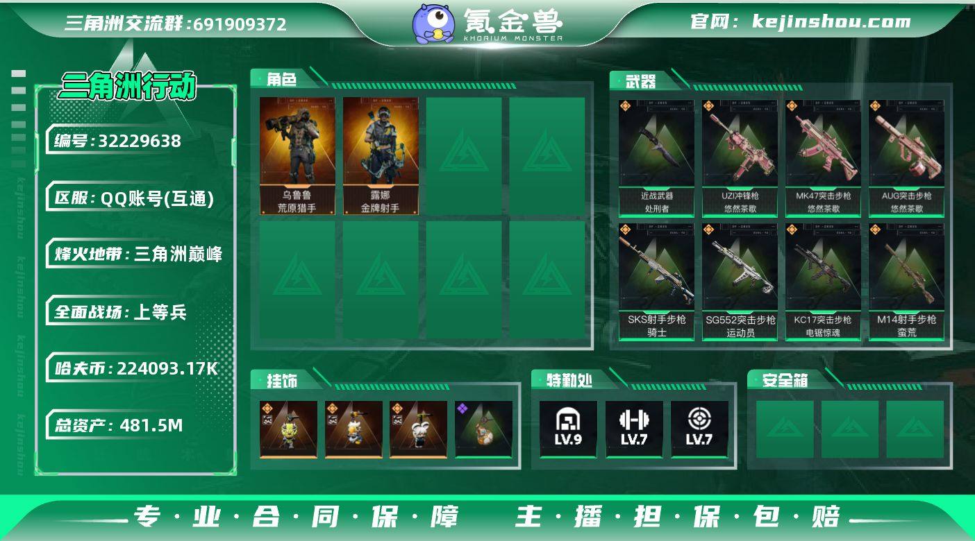 实名:不可二次实名 总资产:481.5M 哈夫币:224093.17K 烽火地带段位:三角洲巅峰 烽火地带等级:60 全面战场段位:上等兵 全面战场等级:15 9级仓库,7级训练中心,7级靶场,6级指挥中心,2级潜水中心,3级防具台,3级工作台,3级制药台,3级技术中心,1级收藏室 战术部门等级:4 战斗部门等级:3 医疗部门等级:3 研发部门等级:3 后勤部门等级:3 曼德尔砖-气象感应:0 曼德尔砖-命运王牌:0 曼德尔砖-电玩高手:0 曼德尔砖-美杜莎:0