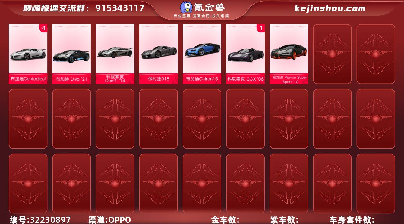 巅峰极速自玩号,OPPO渠道,没有衣服,珍藏7辆,典藏雷文顿,白龙四阶,布加迪系列全满,另一个区有性能帕加尼二阶