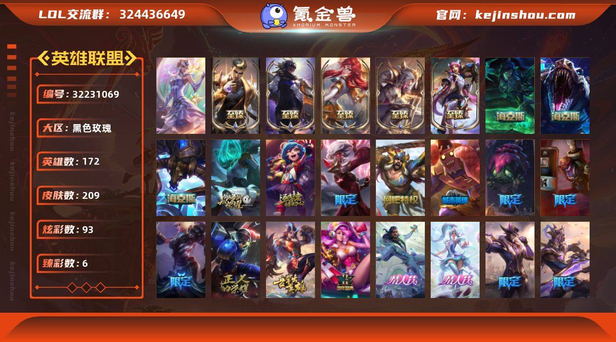 【皇冠号】白银段位-172英雄-209皮肤-93炫彩-1终极-12神话-27限定-27传说-42史诗 【神话皮肤】:十周年纪念安妮,源代码乐芙兰,神凰行者瑞羽圣凰艾尼维亚,海克斯科技阿利斯塔,海克斯科技雷克顿,摄魂使者薇恩,至臻真实伤害赛娜,至臻幻灵战斗猫金克丝,至臻女帝黛安娜,至臻战斗学院拉克丝 【热门头像】:爱情之歌头像 【至臻皮肤】:至臻战斗学院拉克丝,至臻T1杰斯,至臻女帝黛安娜,至臻永恒星灵佐伊,至臻幻灵战斗猫金克丝,至臻真实伤害赛娜 【臻彩皮肤】:吕布奉先炫金战神,星之守护者奥莉安娜未来之光,玉剑传说无劫胭脂,魔女阿卡丽虚荣,西部魔影执行人卡特琳娜纯洁 【年限皮肤】:龙马烈焰波比 【海克斯皮肤】:海克斯科技阿利斯塔,海克斯科技雷克顿,摄魂使者薇恩 【情人节限定】:水晶玫瑰迦娜,水晶玫瑰阿克尚 【冰雪限定】:圣诞精灵崔丝塔娜,喜庆之树茂凯,雪装奈德丽,冰雪驯鹿波比,魄罗骑士瑟庄妮,冰雪女神辛德拉,北极星猎人斯维因 【终极皮肤】:大元素使拉克丝 【限定皮肤】:冠军之刃锐雯2016,SSW雷恩加尔,SKTT1卡莉丝塔,电玩女神厄运小姐,暗裔英雄盖伦,胜利剑圣易,胜利之运崔斯特,胜利女神菲奥娜,无头骑士赫卡里姆,蒙多蒙多,野兽猎人泰达米尔,玉剑传说舞龙卫,征服者卡尔玛,防暴士兵辛吉德,防暴天使凯尔,惊悚派对阿木木 【传说皮肤】:地狱之门卫士加里奥,战地机甲厄加特,大天使长米迦勒凯尔,战场女武神凯尔,钢铁之翼凯尔,源计划林易,提莫约德尔人的一大步,太空律动律动队长提莫,驯龙炮手崔丝塔娜,合金巨兽努努和威朗普,女皇艾希,源计划联合艾希,电玩女神娑娜,冰霜之刃艾瑞莉娅,女警狙击凯特琳,苹果机器人布里茨,炼狱魔犬内瑟斯,青花瓷伊泽瑞尔,黎明使者锐雯,枯萎之壤泽拉斯,灵魂莲华阿狸,宇航员诺提勒斯,泳池派对吉格斯,暗星尊烬,西部天使...
