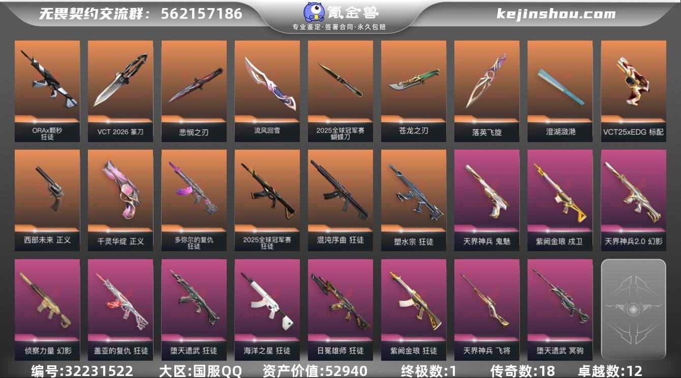 【自带包赔 可赔三倍】:库存价值 52940 25冠军限定精品库存成品号 【限定】: 2025全球冠军赛 狂徒, 2025全球冠军赛 蝴蝶刀, 5周年//公测重制版 苍龙之刃,VCT 2026 篆刀 【近战】: 流风回雪, 落英飞旋, 2025全球冠军赛 蝴蝶刀, 5周年//公测重制版 苍龙之刃, 澄湖潋滟 【狂徒】: 日冕雄师 狂徒, ORA x 颗秒 狂徒, 多弥尔的复仇 狂徒, 2025全球冠军赛 狂徒, 混沌序曲 狂徒, 盖亚的复仇 狂徒, 塑水宗 狂徒, 海洋之星 狂徒, 紫阙金琅 狂徒, 堕天遗武 狂徒,赤焰铁骥 狂徒 【幻影】: 侦察力量 幻影, 天界神兵//2.0 幻影 【冥驹】: 堕天遗武 冥驹 【正义】: 西部未来 正义, 千灵华绽 正义 【戍卫】: 紫阙金琅 戍卫 【鬼魅】: 天界神兵 鬼魅 【标配】: VCT25 x EDG 标配 【飞将】: 天界神兵 飞将 【概要】: 总皮89 终极1 传奇18 卓越12 刀皮7 英雄28 LV124 历史最高:铂金 当前段位:白银 已使用 1100 R点 剩余 45 R点 可二次 卡面、挂饰、其他皮肤请看截图 道具、段位等以实际验号为准。如账号因没有维护,赛季更新等不可抗因素发生变化,不属于账号质量问题"
