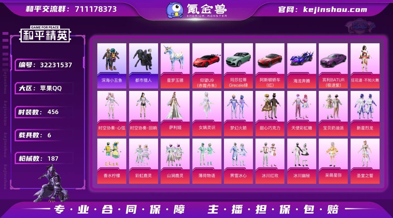 粉装数:21 特效枪数:179 粉枪数:14 载具数:6 套装数量:125 枪皮数量:187 粉色飞行器数量:9 热力值:77018 印记数:7 时装数:456 战备数:130 点券:7 段位:星钻 【卓越王牌】 【可排位】 【可二次实名】 【包人脸】 【是】 【无换绑CD】 优质套装24 优质武器皮肤15 稀有载具7 稀有飞行器10 其他套装104 其他武器皮肤172 优质降落伞42 普通降落伞27 伙伴7 背包138 头盔113 动作34 优质套装:套装-都市猎人,套装-深海小丑鱼,粉装-甜心巧克力,粉装-宝贝奶油派,粉装-天使彩虹糖,粉装-梦幻火箭,粉装-新星烈龙,粉装-彩虹鹿灵,粉装-山涧鹿灵,粉装-香水柠檬,粉装-薄荷物语,粉装-霁雪冰心,粉装-冰川幽秘,粉装-冰川红玫,角色-呆萌星弥,套装-龟仙人,角色-圣堂之誓,粉装-蜜语绒猫,角色-光极星,粉装-时空协奏回响,粉装-时空协奏心弦,角色-狂花道不知火舞,角色-女娲灵识,角色-萨利娅; 优质武器皮肤:M416-电玩时刻,M416-五爪金龙,AKM-甜心宝贝,AKM-梦之光华,AKM-绿萝繁花,GROZA-镜光银凌,M762-电糖天使,SCAR-L-锦绣绵绵,M200-梦海之灵,Kar98K-巳巳如意,Kar98K-梦幻火箭,Mk14-盛世惊鸿,UMP45-量子极限,汤姆逊-冰川粉黛,SPAS-12-蜜语绒猫; 稀有载具:僚机-空客H135蔚蓝之翼,仰望U9(赤霞丹朱),宾利BATUR(极速紫),玛莎拉蒂Grecale(薄荷绿),星梦玉骢,海龙奔腾,阿斯顿马丁DBS(红); 稀有飞行器:极意拳锋飞行器,梦幻童话飞行器,凤舞九天飞行器,幻海精灵飞行器,深渊漩涡飞行器,星夜魔法师飞行翼,镜域双华-灵镜之阶,萌物绒绒飞行器,天之羽翼飞行器,绝色倾城飞行器; 其他套装:套装-黄色运动,套装-白色伏地魔,套装-竞技名士,套装-长空猛禽,套装-漫步者,套装-海岛探路者,套装-都市猎人,套装-贵族骑装,套装-特殊使命,套装-鹰眼刺客,套装-冰冻风暴,套装...