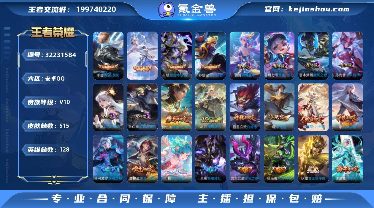 安卓Q-V10-最强王者段位-128英雄-515皮肤-4典藏皮肤-7星元-34传说-167史诗 【英雄全皮】:廉颇全皮,刘禅全皮,扁鹊全皮,典韦全皮,刘邦全皮,孙权全皮,钟馗全皮,鬼谷子全皮,苏烈全皮,狂铁全皮,猪八戒全皮,敖隐全皮,蒙恬全皮,金蝉全皮,戈娅全皮,空空儿全皮,影全皮 【荣耀典藏】:孙悟空全息碎影,李白鸣剑曳影,铠银白咏叹调,伽罗最初的交响 【传说皮肤】:狄仁杰神骥赴朔漠,后羿神树通天,澜愿照九州拓,桑启鸣野蒿,典韦战鼓燎原,艾琳觅芳踪,百里守约碎云,马可波罗深海之息,孙策挚爱之约,瑶时之祈愿,裴擒虎寅虎赤拳,鲁班七号寅虎瑞焰,孙尚香异界灵契,曜李逍遥 ,李元芳飞鸢探春,诸葛亮时雨天司,虞姬启明星使,孙悟空零号赤焰,关羽武圣,曜云鹰飞将,刘备时之恋人,干将莫邪久胜战神,达摩黄金狮子座,百里玄策白虎志,梦奇胖达荣荣,后羿黄金射手座,诸葛亮武陵仙君,貂蝉仲夏夜之梦,李白凤求凰,孙尚香末日机甲,宫本武藏地狱之眼,孙悟空地狱火,吕布天魔缭乱,狄仁杰超时空战士 【限定皮肤】:白起狰,蔡文姬夏日便利店,大乔绒语心约,虞姬夏日便利店,姜子牙天穹之誓,李白谪仙醉月,狄仁杰阴阳师,小乔纯白花嫁,虞姬凯尔特女王,廉颇寅虎御盾,赵云皇家上将,赵云百木心枪,墨子神迹守卫,嬴政优雅恋人,嬴政白昼王子,孙尚香异界灵契,鲁班七号狮舞东方,鲁班七号寅虎瑞焰,庄周高山流水,高渐离死亡摇滚,高渐离玩趣恶龙,阿轲迷踪丽影,钟无艳超时空战士,孙膑妖精王,孙膑寅虎展翼,扁鹊炼金王,扁鹊奇幻香踪,白起夜都怪侠,芈月重明,芈月幻夜卜梦,吕布天魔缭乱,吕布猎兽之王,周瑜真爱至上,周瑜赤莲之焰,元歌云间偶戏,元歌无心,夏侯惇朔风刀,夏侯惇匿光决锋者,甄姬女儿国国王,甄姬游园惊梦,甄姬落雪兰心,曹操烛龙,典韦穷奇,典韦蓝屏警告,典韦岱宗,马可...