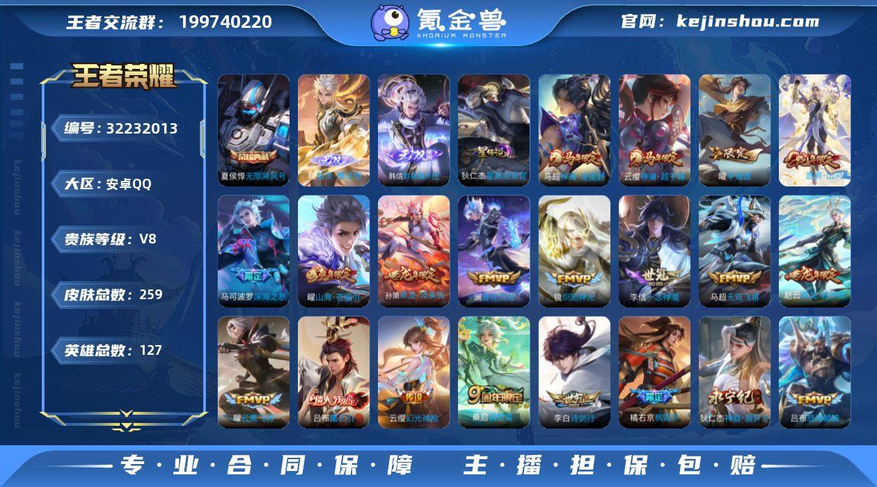 【高性价比·万战金标司空震·全皮曜·无限飓风号·器灵螭龙剑·韩信群星魔术团·神骥越千峰·神骥逐星野·愿照山河定·神器狴犴令·乘龙淬吴钩·乘龙铭钟鼎·深海之息·怒海麟威·枫霜尽·可二次】YXw17572-安卓Q-127英雄-259皮肤-16王者印记-188铭文-贵族积分6w【贵族8】【1典藏·2无双·2星传说·28传说·26按键】【因赛季更新游戏段付以上号为准!】 【英雄全皮】:孙权全皮,敖隐全皮,曜全皮,司空震全皮,空空儿全皮,影全皮 【荣耀典藏】:夏侯惇无限飓风号 【无双皮肤】:曜器灵螭龙剑,韩信群星魔术团 【星元皮肤】:刘备时之思念,狄仁杰星际治安官 【传说皮肤】:云缨神骥越千峰,马超神骥逐星野,司空震愿照山河定,云缨幻光神枪,桑启鸣野蒿,海月金乌负日,吕布曦玄引,孙策乘龙淬吴钩,赵云乘龙铭钟鼎,澜逐花归海,曜山海苍雷引,吕布怒海麟威,李白诗剑行,狄仁杰神器狴犴令,橘右京枫霜尽,马可波罗深海之息,马超无双飞将,曜李逍遥 ,铠绛天战甲,镜炽阳神光,虞姬启明星使,曜云鹰飞将,李信一念神魔,刘备时之恋人,梦奇胖达荣荣,后羿黄金射手座,孙悟空地狱火,狄仁杰超时空战士 【限定皮肤】:蒙犽顽岩魄,大乔绒语心约,姜子牙天穹之誓,狄仁杰阴阳师,赵云皇家上将,嬴政白昼王子,庄周高山流水,扁鹊奇幻香踪,元歌无心,马可波罗深海之息,马可波罗山海玄木吟,狄仁杰魔术师,狄仁杰神器狴犴令,项羽海滩派对,兰陵王金庭之子,橘右京枫霜尽,孙悟空孙行者,后羿如梦令,李元芳云中旅人,虞姬启明星使,杨戬潮玩骑兵,干将莫邪胡桃夹子,雅典娜黎明之约,鬼谷子五谷丰年,百里玄策原初追逐者,梦奇顽趣,沈梦溪大漠名商,裴擒虎擒涛扼浪,曜李逍遥 ,曜山海苍雷引,蒙犽狂想玩偶喵,鲁班大师探海日志,桑启海盐诗旅,艾琳流音漫舞,司空震地狱燃心,阿古朵江河有灵,张良古海寻踪,蒙犽百解令,蒙恬荣...