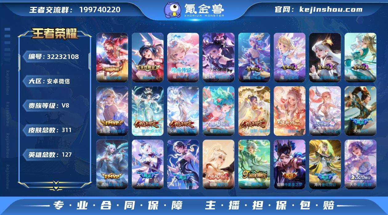 【极品女号·全皮瑶·紫瑶·全皮西施·游龙堇华·全皮杨玉环·全皮女娲·全皮海月·拾光映像·真我赫兹·大耳狗之梦·酷洛米之心·金色仲夏夜·续相思·愿照千秋盛·愿照众生和·心动手记·小动物乐团·挚爱花嫁·至美乘鲤谣·乘龙聚宝船】【可二次】YXw15557-安卓WX-127英雄-311皮肤-8王者印记-180铭文-贵族积分7w【贵族8】【1典藏·2无双·2珍品·4星传说·25传说·32按键】【因赛季更新游戏段付以上号为准!】 【英雄全皮】:杨玉环全皮,女娲全皮,瑶全皮,海月全皮,西施全皮,戈娅全皮,空空儿全皮,海诺全皮,少司缘全皮 【荣耀典藏】:瑶拾光映像 【无双皮肤】:瑶真我赫兹 【珍品传说】:瑶大耳狗之梦,安琪拉酷洛米之心 【星元皮肤】:西施游龙堇华,貂蝉幻舞叠翠,瑶时之愿境,貂蝉金色仲夏夜 【传说皮肤】:王昭君长夜焕生,西施续相思,杨玉环星之鸣奏,女娲愿照千秋盛,妲己愿照众生和,蔡文姬愿照福禄聚,桑启鸣野蒿,朵莉亚心动手记,海月金乌负日,貂蝉曦玄引,孙膑小动物乐团,大乔时之奇旅,安琪拉追逃游戏,大乔挚爱花嫁,孙策挚爱之约,女娲补天,瑶时之祈愿,王昭君乞巧织情,西施游龙清影,虞姬启明星使,貂蝉猫影幻舞,张良黄金白羊座,花木兰冠军飞将,梦奇胖达荣荣,貂蝉仲夏夜之梦 【限定皮肤】:蔡文姬夏日便利店,大乔绒语心约,虞姬夏日便利店,姜子牙天穹之誓,杨戬破阵退雄兵,狄仁杰阴阳师,赵云皇家上将,妲己时之彼端,妲己时之奇旅,高渐离玩趣恶龙,钟无艳超时空战士,孙膑寅虎展翼,扁鹊奇幻香踪,白起夜都怪侠,芈月幻夜卜梦,元歌无心,甄姬女儿国国王,甄姬落雪兰心,马可波罗暗影游猎,狄仁杰魔术师,达摩沙漠行僧,项羽海滩派对,貂蝉逐梦之音,安琪拉魔法小厨娘,安琪拉追逃游戏,王昭君午后时光,兰陵王驯魔猎人,兰陵王金庭之子,李元芳云中旅人,虞姬启明星使,杨玉环遇见飞天,杨玉环寅虎心...