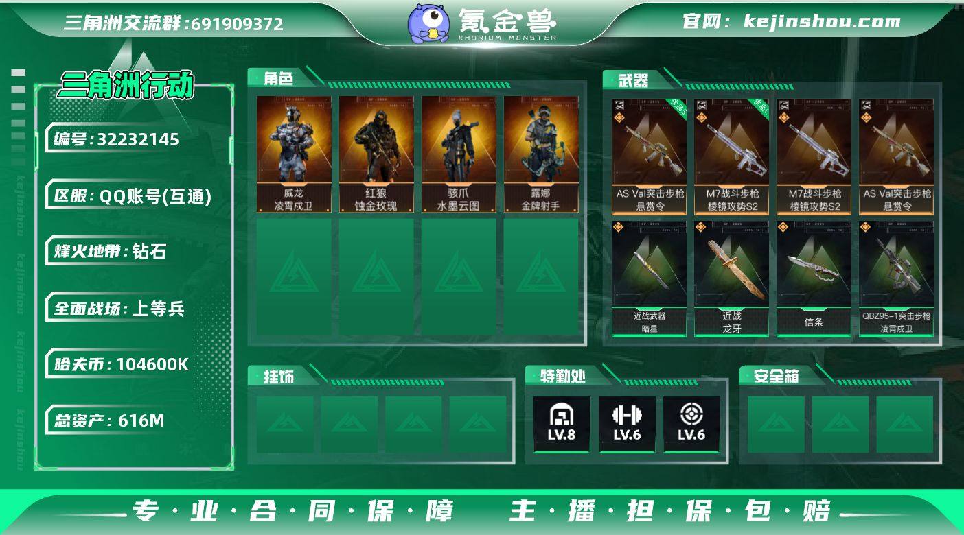 【高氪金土豪号-三红皮+三刀皮+二典藏皮肤.高额资产616M】【暗星.信条.龙牙.蚀金玫瑰.水墨云图.凌霄戍卫】【Q区三端互通】【无二次】YXz8879-特勤处:仓库8级/靶场6级/训练中心6级-总资产616.8m-哈夫币104m-烽火等级:60级 【干员外观】:红狼-蚀金玫瑰,骇爪-水墨云图,威龙-凌霄戍卫,露娜-金牌射手 【近战皮肤】:近战-暗星,近战-信条,近战-龙牙,近战-黑鹰 【典藏外观】:M7战斗步枪-棱镜攻势S2,AS Val突击步枪-悬赏令 【典藏外观成色】:M7战斗步枪-棱镜攻势S2(优品C),AS Val突击步枪-悬赏令(优品S) 【传说外观】:M4A1突击步枪-蚀金玫瑰,M4A1突击步枪-阿米娅,QBZ95-1突击步枪-凌霄戍卫,ASh-12战斗步枪-鹅鸭杀,AUG突击步枪-零重力,SG552突击步枪-运动员,AK-12突击步枪-特斯拉线圈,SCAR-H战斗步枪-水墨云图,SCAR-H战斗步枪-启航,SCAR-H战斗步枪-荼蘼,腾龙突击步枪-万金泪冠,K437突击步枪-几何解构,MK47突击步枪-暗星,P90冲锋枪-信条,Vector冲锋枪-能天使-午夜邮差,UZI冲锋枪-特斯拉线圈,SR-3M紧凑突击步枪-特斯拉线圈,SR-3M紧凑突击步枪-暗星,勇士冲锋枪-能天使-午夜邮差,M250通用机枪-骑士之心,M14射手步枪-蛮荒,M14射手步枪-缄花,SKS射手步枪-骑士,SR-25射手步枪-信条,SR-25射手步枪-缄花,.357左轮-缄花 【史诗外观】:K437突击步枪-私人定制,腾龙突击步枪-檀劫铳影,K416突击步枪-冬日风情,K416突击步枪-腊梅,K416突击步枪-阿萨拉特攻,M7战斗步枪-百步穿杨,SG552突击步枪-深海恐惧,SG552突击步枪-哈夫克警备,SCAR-H战斗步枪-囚徒,G3战斗步枪-流沙送葬,AS Val突击步枪-百步穿杨,腾龙突击步枪-猎鳄行动,KC17突击步枪-缄默情歌,MP5冲锋枪-战术竞备,MP5冲锋枪-竞技风,Vector冲锋枪-百步穿杨,SR-3M紧凑突击步枪-战术竞备,勇士冲锋枪-丛影谍踪,MP7冲锋枪-守护者,...