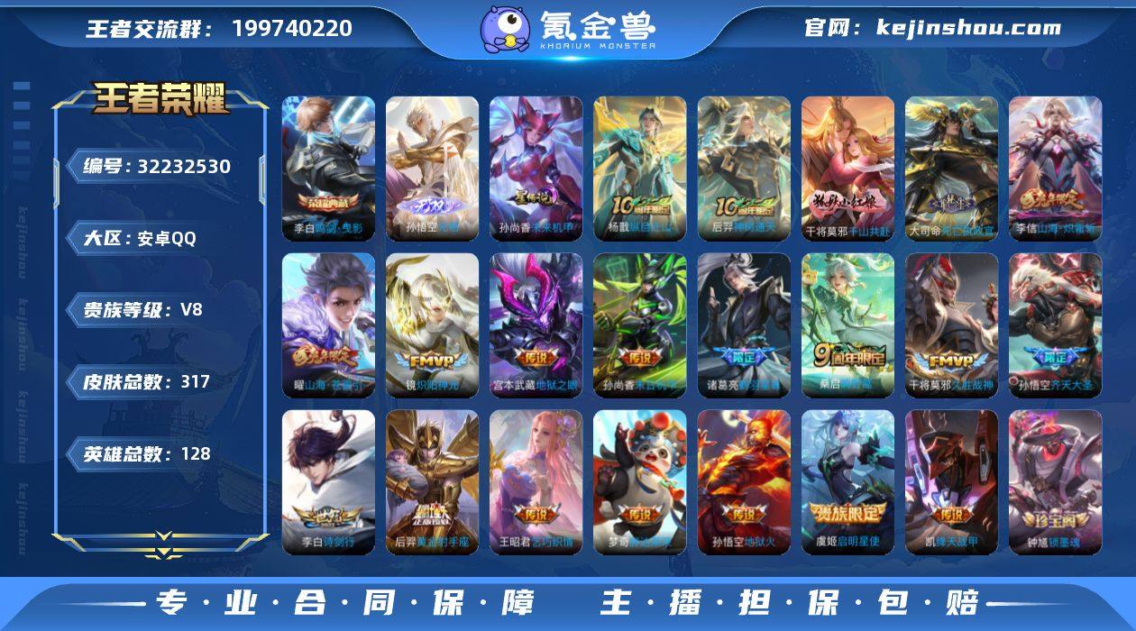 可二次【特价出售/店主推荐】安卓Q-V8-至尊星耀III段位-128英雄-317皮肤-1典藏皮肤-1无双-1星传说-20传说-93史诗 【英雄全皮】:孙权全皮,敖隐全皮 【荣耀典藏】:李白鸣剑曳影 【无双皮肤】:孙悟空无相 【传说皮肤】:杨戬纵目迁山,后羿神树通天,干将莫邪千山共赴,大司命死亡执政官,桑启鸣野蒿,诸葛亮鹤羽星尊,孙悟空齐天大圣,曜山海苍雷引,李信山海炽霜斩,李白诗剑行,王昭君乞巧织情,铠绛天战甲,镜炽阳神光,虞姬启明星使,干将莫邪久胜战神,梦奇胖达荣荣,后羿黄金射手座,孙尚香末日机甲,宫本武藏地狱之眼,孙悟空地狱火 【限定皮肤】:白起狰,虞姬夏日便利店,姜子牙天穹之誓,狄仁杰阴阳师,虞姬凯尔特女王,赵云皇家上将,赵云龙胆,嬴政白昼王子,孙尚香蔷薇恋人,鲁班七号狮舞东方,高渐离玩趣恶龙,钟无艳王者之锤,孙膑妖精王,扁鹊炼金王,芈月重明,芈月幻夜卜梦,吕布猎兽之王,周瑜赤莲之焰,元歌云间偶戏,元歌无心,夏侯惇朔风刀,曹操烛龙,典韦穷奇,马可波罗逐梦之星,马可波罗山海玄木吟,狄仁杰魔术师,狄仁杰万华元夜,达摩星际陆战队,达摩沙漠行僧,项羽海滩派对,老夫子醍醐杖,关羽冰锋战神,貂蝉逐梦之音,程咬金演武夺筹,露娜一生所爱,韩信逐梦之影,韩信飞衡,兰陵王驯魔猎人,兰陵王金庭之子,亚瑟潮玩骑士王,孙悟空至尊宝,孙悟空大圣娶亲,孙悟空齐天大圣,牛魔御旌,后羿如梦令,李元芳云中旅人,虞姬启明星使,钟馗神迹守卫,钟馗驱傩正仪,杨玉环遇见飞天,雅典娜黎明之约,蔡文姬繁星吟游,太乙真人饕餮,鬼谷子原初探秘者,诸葛亮鹤羽星尊,黄忠火炮绅士,苏烈千军破阵,百里守约朱雀志,弈星混沌棋,明世隐疑决卦,裴擒虎李小龙,裴擒虎擒涛扼浪,狂铁御狮,米莱狄御霄,米莱狄胡桃异想国,云中君纤云弄巧,李信山海炽霜斩,盾山御銮,猪八戒猪悟能,...