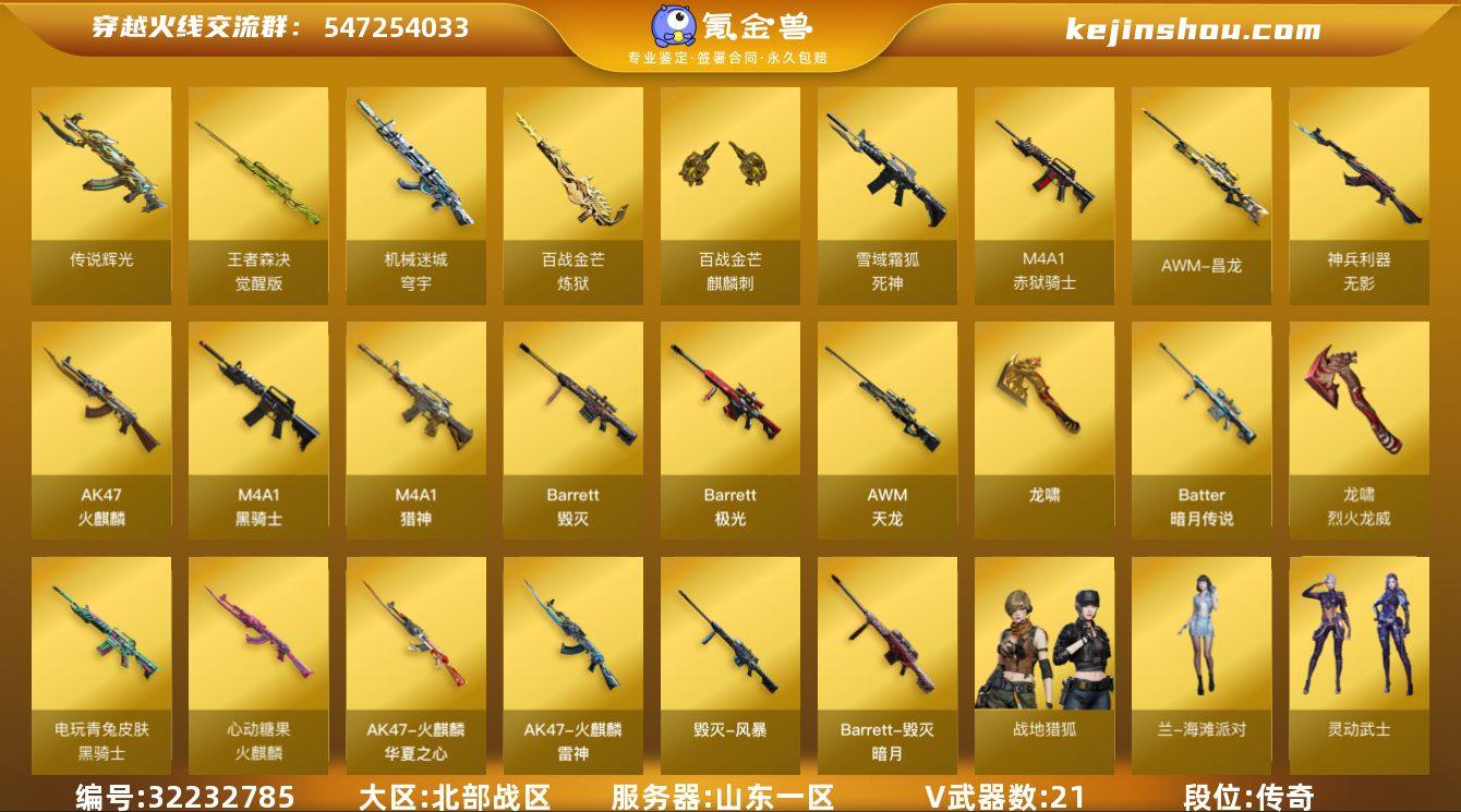 【ky6257】山东一区-23V-1王者武器数-0炫金武器数 【传说武器】:传说辉光 【热门武器】:传说辉光,QBZ03-街机,M4A1-黑骑士 【音效卡】:M4A1-黑骑士音效卡,炼狱-百战金芒-庆典舞曲音效卡,死神-雪域霜狐-怀旧音效卡,M4A1-雷神-怀旧音效卡,Barrett-毁灭-怀旧音效卡 【皮肤】:M4A1-再燃火线,火麒麟-雷神,火麒麟-华夏之心,火麒麟-心动糖果,毁灭-暗月,毁灭-风暴,黑骑士-电玩青兔皮肤,修罗-百战金芒 皮肤,轻型军用手斧-再燃火线 【角色】:战地猎狐,雪域霜狐,葵-阿尔法武装,暗夜-X,飞虎队-X,风暴女,嘉年华灵狐,兰-海滩派对,兰妹妹,灵动武士,零-水下丽影,潘多拉-X,潘多拉-甜心教官,斯沃特-X,兔囡囡 【人偶武器】:M4A1-雷神-精英刀锋,灵狐娃娃手雷 【挑战大师】:激光毁灭者III 【英雄级武器】:AK47-火麒麟*2,M4A1-黑骑士,无影-神兵利器,死神-雪域霜狐,M4A1-猎神,机械迷城-穹宇,AWM-天龙,Barrett-毁灭,Barrett-极光,Barrett-金色蔷薇,王者森决-觉醒版,Barrett-暗月传说,炼狱-百战金芒,龙啸,麒麟刺-百战金芒,龙啸-烈火龙威,高爆手雷-幻灵,闪光弹-幻灵,M4A1-赤狱骑士,AWM-昌龙 【源级武器】:火麒麟-雷神,源·雷神,魂·雷神-诺拉,...