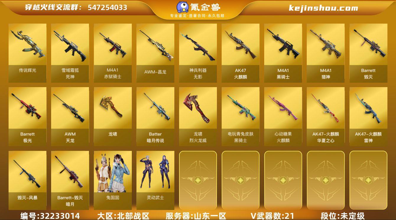 山东一区-23V-1王者武器数-0炫金武器数 【传说武器】:传说辉光 【热门武器】:传说辉光,QBZ03-街机,M4A1-黑骑士 【音效卡】:M4A1-黑骑士音效卡,炼狱-百战金芒-庆典舞曲音效卡,死神-雪域霜狐-怀旧音效卡,M4A1-雷神-怀旧音效卡,Barrett-毁灭-怀旧音效卡 【皮肤】:M4A1-再燃火线,火麒麟-雷神,火麒麟-华夏之心,火麒麟-心动糖果,毁灭-暗月,毁灭-风暴,黑骑士-电玩青兔皮肤,修罗-百战金芒 皮肤,轻型军用手斧-再燃火线 【角色】:战地猎狐,雪域霜狐,葵-阿尔法武装,暗夜-X,飞虎队-X,风暴女,嘉年华灵狐,兰-海滩派对,兰妹妹,灵动武士,零-水下丽影,潘多拉-X,潘多拉-甜心教官,斯沃特-X,兔囡囡 【人偶武器】:M4A1-雷神-精英刀锋,灵狐娃娃手雷 【挑战大师】:激光毁灭者III 【英雄级武器】:AK47-火麒麟*2,M4A1-黑骑士,无影-神兵利器,死神-雪域霜狐,M4A1-猎神,机械迷城-穹宇,AWM-天龙,Barrett-毁灭,Barrett-极光,Barrett-金色蔷薇,王者森决-觉醒版,Barrett-暗月传说,炼狱-百战金芒,龙啸,麒麟刺-百战金芒,龙啸-烈火龙威,高爆手雷-幻灵,闪光弹-幻灵,M4A1-赤狱骑士,AWM-昌龙 【源级武器】:火麒麟-雷神,源·雷神,魂·雷神-诺拉,魂·雷神-神...