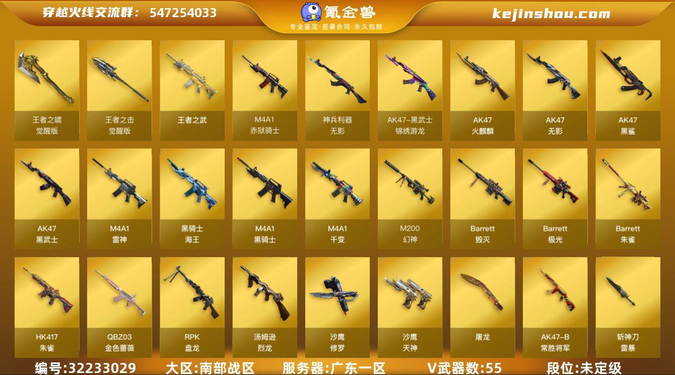 广东一区-59V-4王者武器数-0炫金武器数 【热门武器】:QBZ03-金色蔷薇,HK417-朱雀,M200-幻神,死亡之眼*2,M4A1-黑骑士*2,汤姆逊-烈龙*6,RPK-盘龙*6,加特林-炼狱,沙鹰-修罗*2 【王者炫金武器】:王者之武 【音效卡】:M4A1-黑骑士音效卡,Barrett-毁灭音效卡 【皮肤】:雷神-暗月,火麒麟-心动糖果,毁灭-星空,毁灭-英雄计划 皮肤,M4A1-千变-孔明皮肤,战神-粉色甜心皮肤,战神-紫绶金章皮肤,战神-流金岁月皮肤,AK47-B-常胜将军-曹操*2,AK47-B-常胜将军-孙权 【角色】:战地猎狐,王者-瞳-闭月羞花,王者复仇,王者玲珑-小乔,暗夜-X,北极狐-X,虎妞,嘉年华灵狐,娟娟,灵狐者-职业经理,龙儿,龙儿-小淘气,潜龙队-X,邱刚敖,斯沃特-X,蜀雪,雪莉杨 【人偶武器】:天龙-曼陀罗,火麒麟-灵狐*2,AWM-灵狐-15周年嘉年华,海滩汪汪-巴雷特,迷你生化手雷,生化手雷-机甲核心*3,闪光弹-小乔,闪光弹-貂蝉,高爆手雷-大乔,迷你艾比,灵狐娃娃手雷*2 【暴走生化】:死亡之眼*2,超级对讲机 【挑战大师】:冰龙粉碎者-白马银枪 【英雄级武器】:M4A1-千变,AK47-火麒麟*2,M4A1-雷神,M4A1-黑骑士*2,AK47-无影,AK47-黑武士,AK47-黑鲨,HK417-朱雀,无影-神兵利器,黑武士-锦绣游龙,QBZ03-金色蔷薇,AK-47-猩红传说,AK47-B-战神,黑骑士-海王*2,AK47-B-常胜将军,Barrett-毁灭,Barrett-极光,M200-幻神,Barrett-朱雀,王者之怒-觉醒版,RPK-盘龙*6,加特林-炼狱,汤姆逊-烈龙*6,沙鹰-修罗*2,沙鹰-天神*3,屠龙*2,斩神刀-雷暴,王者之啸-觉醒版,王者之击-觉醒版,高爆手雷-雷暴,闪光弹-雷暴,烟雾弹-雷暴,烟雾弹-幻灵,M4A1-赤狱骑士 【道具】:CFS限定背包,XROCK炫彩背包,亚洲杯纪念炫彩背包,老虎背包,背包-洛丽塔,超级背包,救世主-黑桃战神,黄金生化钩,绿色巨人,灵魂忍者*