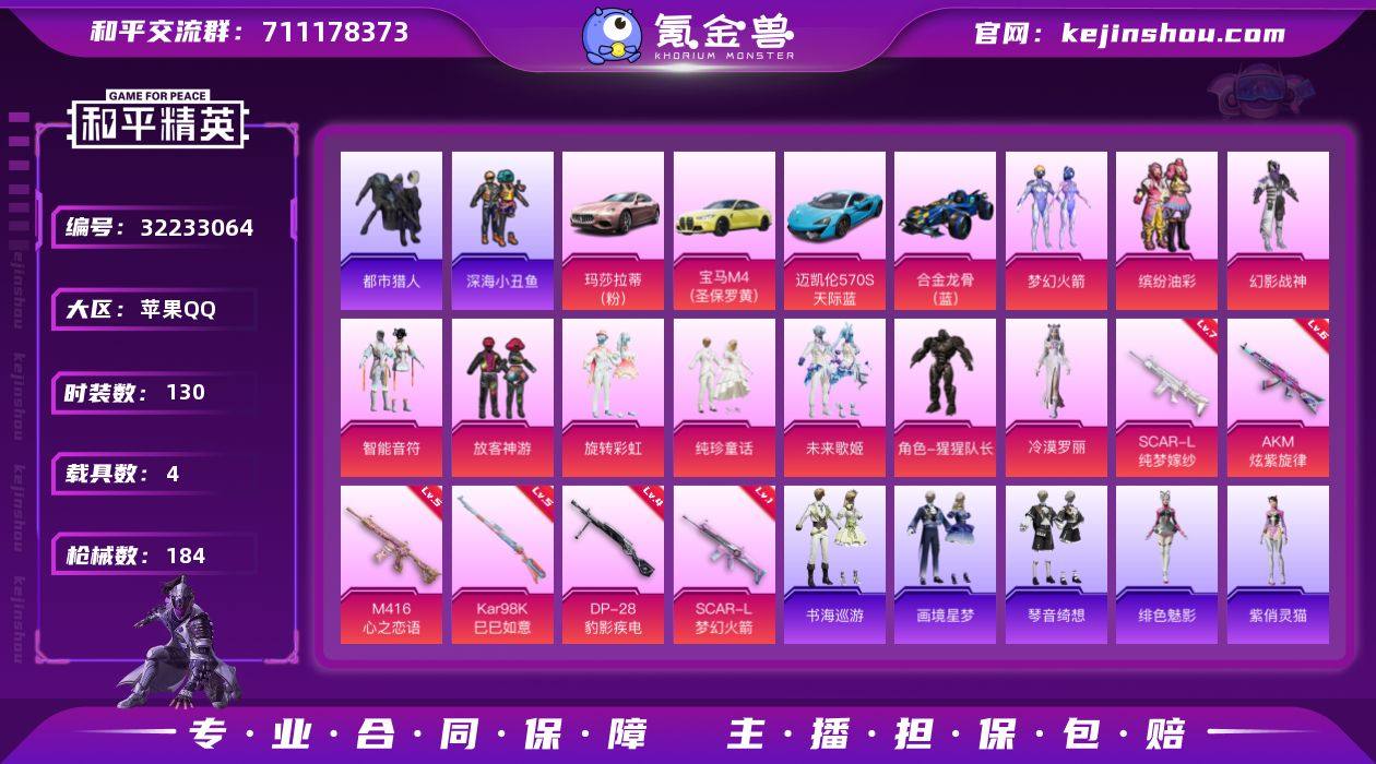 苹果【男神号 粉装-梦幻火箭,粉装-缤纷油彩,套装-都市猎人,套装-金羽特工,套装-暗影哥特,角色-Mark.06,粉装-放客神游,AKM-炫紫旋律(六级),SCAR-L-梦幻火箭(一级),SCAR-L-纯梦嫁纱(七级),M416-心之恋语(五级),玛莎拉蒂Ghibli(粉),宝马M4(圣保罗黄),迈凯伦570S(天际蓝)】 手Q-10粉装-9特效枪-4载具-5粉色飞行器-64698热力值-12王牌印记-130套装-184枪皮 【热门品类】:粉装-梦幻火箭,粉装-缤纷油彩,套装-浪漫天命,套装-都市猎人,套装-深海小丑鱼,套装-小丑鱼,套装-金羽特工,套装-龟仙人,套装-暗影哥特,套装-粉红小猪,角色-Mark.06,套装-红熊茄茄 【粉色套装】:粉装-幻影战神,粉装-梦幻火箭,粉装-智能音符,粉装-缤纷油彩,粉装-放客神游,粉装-旋转彩虹,粉装-纯珍童话,粉装-未来歌姬,角色-猩猩队长,角色-冷漠罗丽 【粉色枪皮等级】:AKM-炫紫旋律(六级),SCAR-L-梦幻火箭(一级),SCAR-L-纯梦嫁纱(七级),M416-心之恋语(五级),UMP45-萌骑冒险(一级),AKS-74U-森灵之息(五级),Kar98K-巳巳如意(五级),Mk14-福马献瑞(四级),DP-28-豹影疾电(四级) 【粉色载具】:玛莎拉蒂Ghibli(粉),宝马M4(圣保罗黄),迈凯伦570S(天际蓝),合金龙骨(蓝) 【粉色枪皮】:AKM-炫紫旋律,SCAR-L-梦幻火箭,SCAR-L-纯梦嫁纱,M416-心之恋语,UMP45-萌骑冒险,AKS-74U-森灵之息,Kar98K-巳巳如意,Mk14-福马献瑞,DP-28-豹影疾电 【粉色飞行器】:炫彩糖果飞行器,梦幻火箭飞行器,桃夭倾城飞行器,星际浪客飞行器,极意拳锋飞行器 【粉色降落伞】:梦幻火箭降落伞,洛神天依降落伞,桃夭倾城降落伞,第五大道降落伞,猪猪侠降落伞,忍者神龟降落伞,樱桃泡泡降落伞,异瞳寒姬降落伞,炫彩糖果降落伞 【稀有套装】:套装-龟仙人,套装-雪国风尚,套装-炫彩糖果,套装-马上有钱,角色-多纳泰...