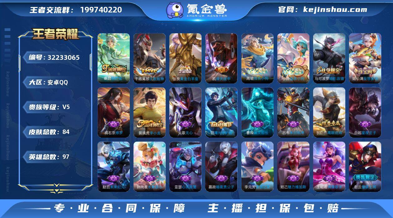 【WZ181251】84皮肤-5传说-19史诗【传说皮肤】:韩信踏浪归,桑启鸣野蒿,铠绛天战甲,张良黄金白羊座,干将莫邪久胜战神【限定皮肤】:姜子牙天穹之誓,狄仁杰阴阳师,赵云皇家上将,元歌无心,夏侯惇朔风刀,马可波罗暗影游猎,狄仁杰万华元夜,项羽海滩派对,老夫子醍醐杖,程咬金演武夺筹,钟馗驱傩正仪,鬼谷子原初探秘者,苏烈千军破阵,弈星混沌棋,明世隐疑决卦,裴擒虎李小龙,米莱狄御霄,盾山御銮,猪八戒西部大镖客,姬小满妄想食味【赛季限定】:米莱狄御霄,盾山御銮,夏侯惇朔风刀,弈星混沌棋,明世隐疑决卦,老夫子醍醐杖,鬼谷子原初探秘者,狄仁杰万华元夜,程咬金演武夺筹,钟馗驱傩正仪,苏烈千军破阵,姜子牙天穹之誓,东皇太一噬灭天穹【战令限定】:马可波罗暗影游猎,猪八戒西部大镖客,周瑜线条小狗,小乔线条小狗【史诗皮肤】:周瑜线条小狗,小乔线条小狗,姬小满妄想食味,元歌无心,裴擒虎李小龙,马可波罗暗影游猎,橘右京修罗,狄仁杰鹰眼统帅,白起星夜王子,李元芳逐浪之夏,铠曙光守护者,亚瑟心灵战警,吕布末日机甲,曹操幽灵船长,妲己魅力维加斯,嬴政暗夜贵公子,孙尚香水果甜心,王昭君偶像歌手,赵云未来纪元,赵云皇家上将【其他...