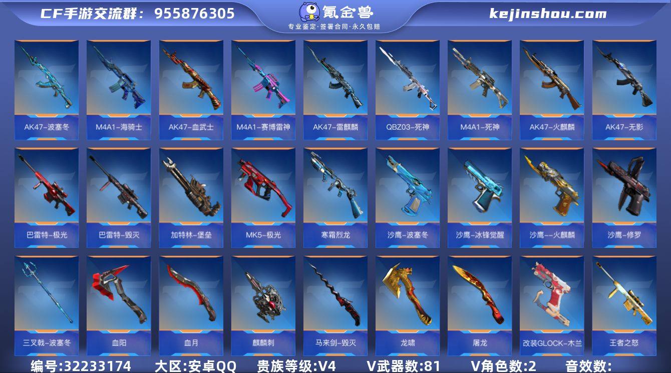 【XY11】VIP4/81V/王者之怒/81式-阿波罗/审判者/职场灵狐赛事经理/AK47-无影/AK47-火麒麟/AK47-雷麒麟/AK47-血武士/AK47-波塞冬/AK47-木兰/M4A1-死神/M4A1-赛博雷神/M4A1-海骑士/M14EBR-玄武/QBZ03-死神/巴雷特-毁灭/巴雷特-极光/加特林-堡垒/MK5-极光/寒霜烈龙/沙鹰-修罗/沙鹰--火麒麟/沙鹰-波塞冬/沙鹰-冰锋觉醒/改装GLOCK-木兰/GLOCK18-猎神/龙啸/血阳/屠龙/血月/麒麟刺/马来剑-毁灭/唐刀-华夏传说/三叉戟-波塞冬