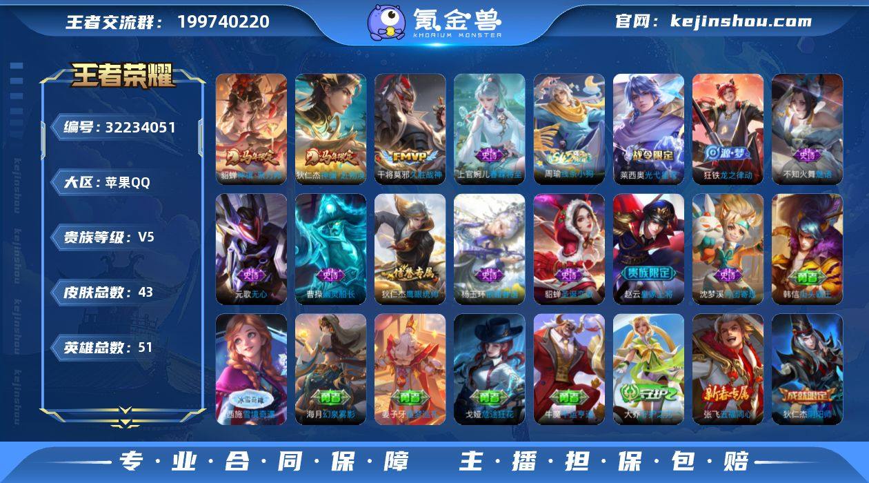 安卓Q-V6-至尊星耀II段位-120英雄-126皮肤-1典藏皮肤-9传说-36史诗 【英雄全皮】:孙权全皮,敖隐全皮 【荣耀典藏】:铠银白咏叹调 【传说皮肤】:花木兰异界灵契,澜愿照九州拓,桑启鸣野蒿,赵云乘龙铭钟鼎,铠绛天战甲,李信一念神魔,刘备时之恋人,张良黄金白羊座,宫本武藏地狱之眼 【限定皮肤】:狄仁杰阴阳师,赵云皇家上将,高渐离玩趣恶龙,元歌无心,甄姬游园惊梦,狄仁杰魔术师,达摩沙漠行僧,项羽海滩派对,兰陵王金庭之子,刘备百相守梦,李元芳云中旅人,杨戬潮玩骑兵,鬼谷子五谷丰年,沈梦溪大漠名商,裴擒虎李小龙,裴擒虎擒涛扼浪,鲁班大师探海日志,桑启海盐诗旅,张良古海寻踪,鬼谷子天穹祈灯,姬小满妄想食味,赵云乘龙铭钟鼎,刘邦剑破天穹,程咬金群星魔术团,周瑜熔金海岸 【年限皮肤】:赵云乘龙铭钟鼎,澜愿照九州拓 【赛季限定】:达摩沙漠行僧,兰陵王金庭之子,沈梦溪大漠名商,李元芳云中旅人,桑启海盐诗旅,裴擒虎擒涛扼浪,鲁班大师探海日志,张良古海寻踪,鬼谷子天穹祈灯,刘邦剑破天穹,太乙真人谧流熔炉,钟馗虚灵犬护,甄姬逆浪荇歌,亚瑟荣光之誓 【战令限定】:杨戬潮玩骑兵,周瑜线条小狗,小乔线条小狗 【史诗皮肤】:周瑜线条小狗,小乔线条小狗,狂铁龙之律动,阿轲化蝶舞,姬小满妄想食味,刘备百相守梦,元歌无心,鬼谷子五谷丰年,澜赏金猎手,司马懿暗渊魔法,裴擒虎李小龙,橘右京修罗,狄仁杰鹰眼统帅,大乔猫狗日记,孙策猫狗日记,白起星夜王子,程咬金功夫厨神,蔡文姬舞动绿茵,亚瑟心灵战警,甄姬游园惊梦,兰陵王暗隐猎兽者,夏侯惇乘风破浪,刘邦德古拉伯爵,花木兰水晶猎龙者,李白千年之狐,曹操幽灵船长,刘禅绅士熊喵,吕布圣诞狂欢,墨子金属风暴,妲己魅力维加斯,孙尚香水果甜心,宫本武藏鬼剑武藏,狄仁杰魔术师,貂蝉圣诞恋歌,赵云未来纪...