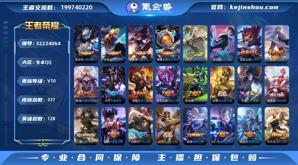 实名: 可修改 性别: 男号 贵族等级: V10 英雄数: 128 皮肤数: 337 荣耀水晶: 星空梦想,无限飓风号,杀手不太冷,全息碎影 传说皮: 黄金狮子座,黄金射手座,冠军飞将,云鹰飞将,猫影幻舞,一念神魔,云霓雀翎,末日机甲-孙尚香,地狱火,仲夏夜之梦,海洋之心,地狱之眼,超时空战士-狄仁杰,山海·炽霜斩,艾琳觅芳踪,九山相柳,神树通天 限定皮: 冰锋战神,遇见飞天,李小龙,梁祝,云端筑梦师,引擎之心,辉光之辰,天魔缭乱,神威,蜜橘之夏,永曜之星,天狼征服者,逐梦之音,青春决赛季,逐梦之翼,天狼狩猎者,冰霜恋舞曲,逐梦之星,热情桑巴,神奇女侠,天狼绘梦者,凤求凰,美猴王,白虎志,瑞麟志,玄武志,朱雀志,梅西,至尊宝,一生所爱,武陵仙君,大圣娶亲,霸王别姬-虞姬,高山流水,猪悟能,五谷丰年,山海·玄木吟,齐天大圣 亮点: 【优质装备】:星空梦想(太空人),无限飓风号(高达),杀手不太冷,全息碎影(猴子典藏),黄金狮子座,黄金射手座,冠军飞将,云鹰飞将(小将军),猫影幻舞,一念神魔,云霓雀翎,末日机甲-孙尚香(绿蚂蚱),地狱火,仲夏夜之梦(大飞蛾),海洋之心,地狱之眼,超时空战士-狄仁杰,山海·炽霜斩(李信年限),艾琳觅芳踪