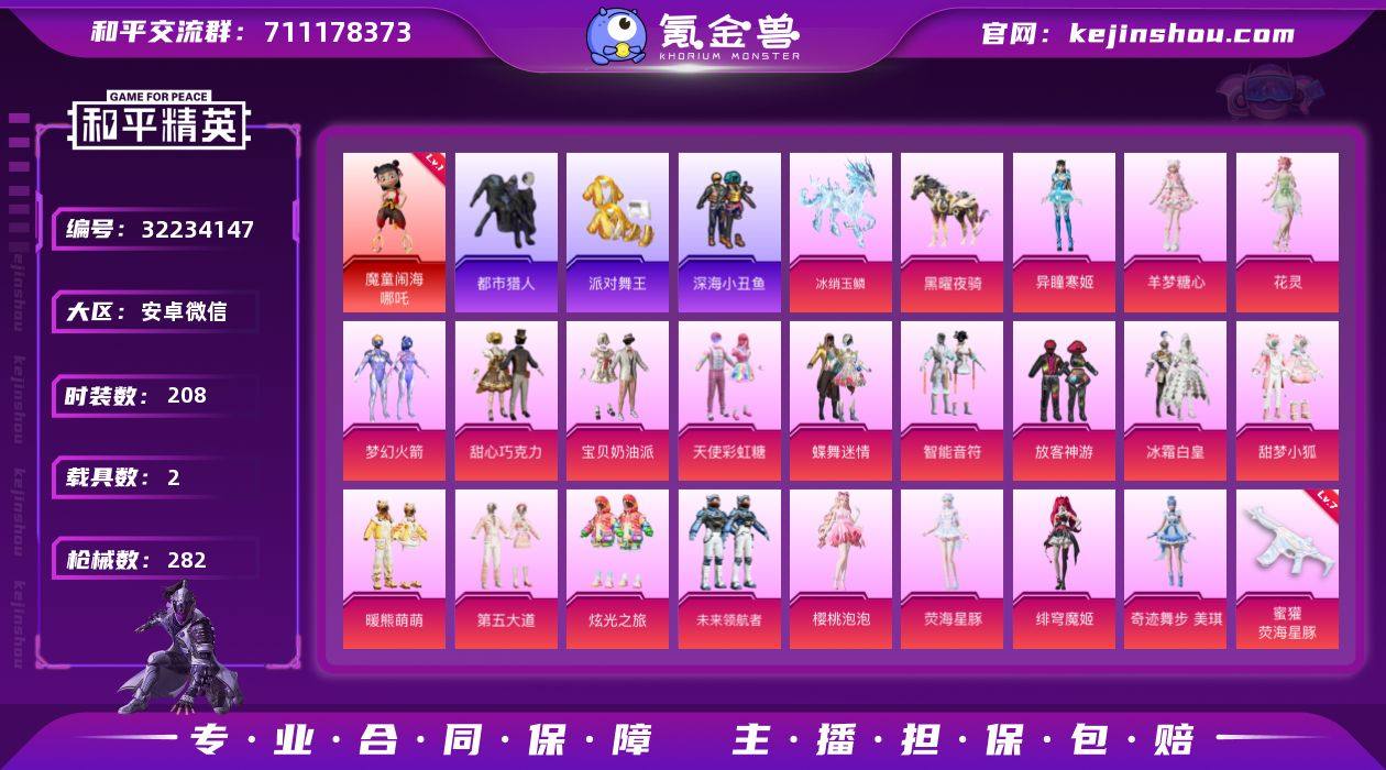【特价出售】安卓 微信-1神装-20粉装-20特效枪-2载具-6粉色飞行器-98437热力值-17王牌印记-208套装-282枪皮 【红色神装等级】:魔童闹海-哪吒(一级) 【红色角色神装】:魔童闹海-哪吒 【热门品类】:粉装-梦幻火箭,套装-浪漫天命,套装-都市猎人,套装-派对舞王,套装-深海小丑鱼,套装-AG战队服,套装-龟仙人,套装-潮萌小黄鸭,套装-糯粉咩咩,套装-红熊茄茄 【粉色套装】:粉装-甜心巧克力,粉装-宝贝奶油派,粉装-天使彩虹糖,粉装-蝶舞迷情,粉装-梦幻火箭,粉装-智能音符,粉装-放客神游,粉装-冰霜白皇,粉装-甜梦小狐,粉装-暖熊萌萌,粉装-第五大道,粉装-炫光之旅,粉装-未来领航者,角色-樱桃泡泡,角色-荧海星豚,角色-绯穹魔姬,角色-奇迹舞步 美琪,角色-花灵,角色-羊梦糖心,角色-异瞳寒姬 【粉色枪皮等级】:AKM-绿萝繁花(五级),SCAR-L-锦绣绵绵(五级),SCAR-L-魔童闹海 哪吒(三级),M416-风花雪月(五级),M416-电玩时刻(五级),M416-灵猫魔法师(三级),GROZA-香水柠檬(六级),AUG-暖羊咩咩(五级),M762-青锋波束(五级),蜜獾-荧海星豚(七级),UMP45-量子极限(五级),Vector-绯穹魔姬(七级),AKS-74U-森灵之息(五级),Kar98K-巳巳如意(五级),Mk14-精灵梦叶罗丽(四级),Mk14-樱桃泡泡(三级),DP-28-豹影疾电(三级),PKM-萌骑夺宝(五级),平底锅-喜羊羊与灰太狼(二级),燃烧瓶-薄荷可可(四级) 【粉色载具】:黑曜夜骑,冰绡玉鳞 【粉色枪皮】:AKM-绿萝繁花,SCAR-L-锦绣绵绵,SCAR-L-魔童闹海 哪吒,M416-风花雪月,M416-电玩时刻,M416-灵猫魔法师,GROZA-香水柠檬,AUG-暖羊咩咩,M762-青锋波束,蜜獾-荧海星豚,UMP45-量子极限,Vector-绯穹魔姬,AKS-74U-森灵之息,Kar98K-巳巳如意,Mk14-精灵梦叶罗丽,Mk14-樱桃泡泡,DP-28-豹影疾电,PKM-萌骑夺宝,平底锅-喜羊羊与灰太狼,燃烧瓶-薄荷...